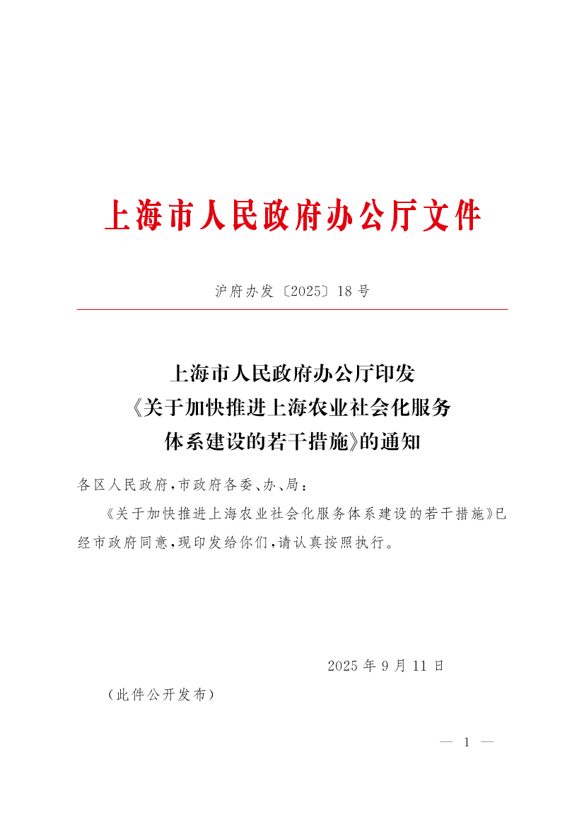 上海市人民政府辦公廳印發(fā)《關于加快推進上海農業(yè)社會化服務體系建設的若干措施》的通知