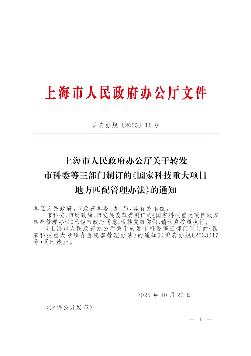 上海市人民政府辦公廳關(guān)于轉(zhuǎn)發(fā)市科委等三部門制訂的《國家科技重大項(xiàng)目地方匹配管理辦法》的通知