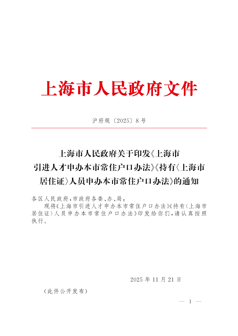 ??本辦法自2025年12月1日起施行,有效期至2030年11月30日。2024年12月市政府印發(fā)的《持有〈上海市居住證〉人員申辦本市常住戶口辦法》(滬府規(guī)〔2024〕17號)同時廢止。