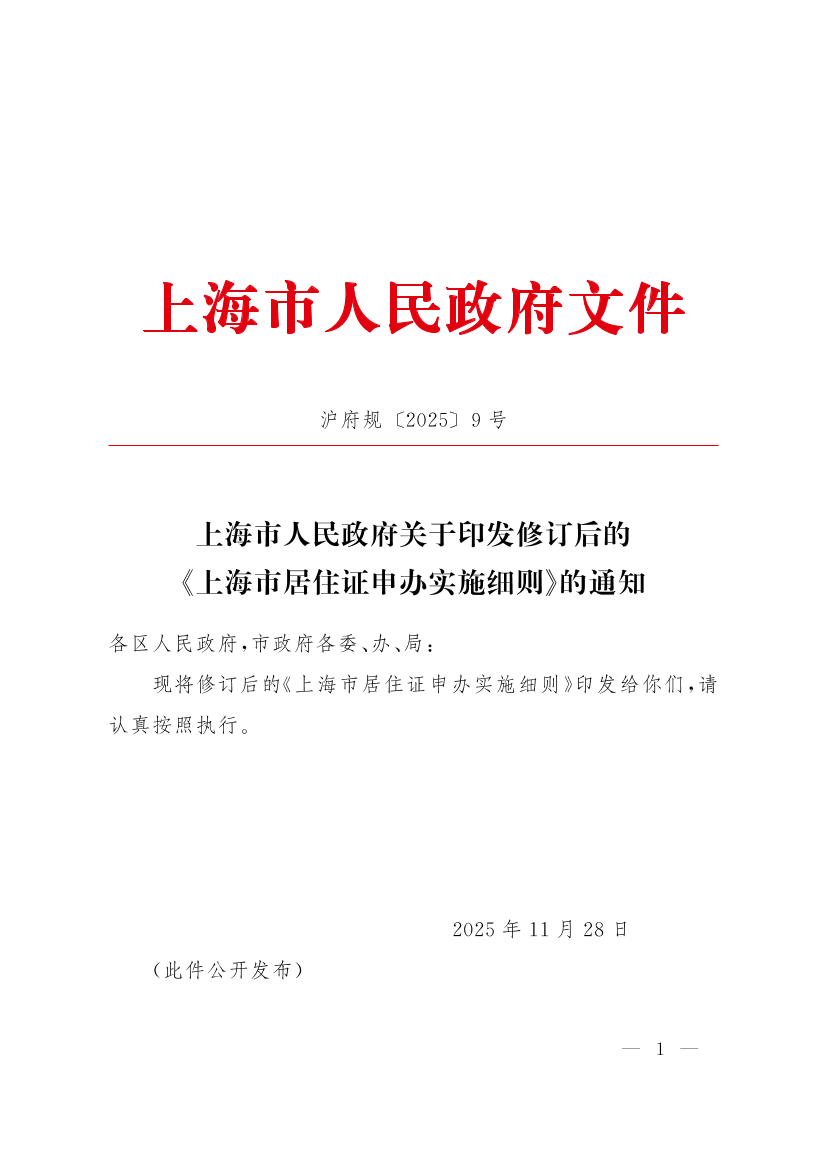 ??本實(shí)施細(xì)則自2025年12月1日起施行,有效期至2030年11月30日?!渡虾J腥嗣裾P(guān)于印發(fā)修訂后的〈上海市居住證申辦實(shí)施細(xì)則〉的通知》(滬府規(guī)〔2023〕2號)同時(shí)廢止。