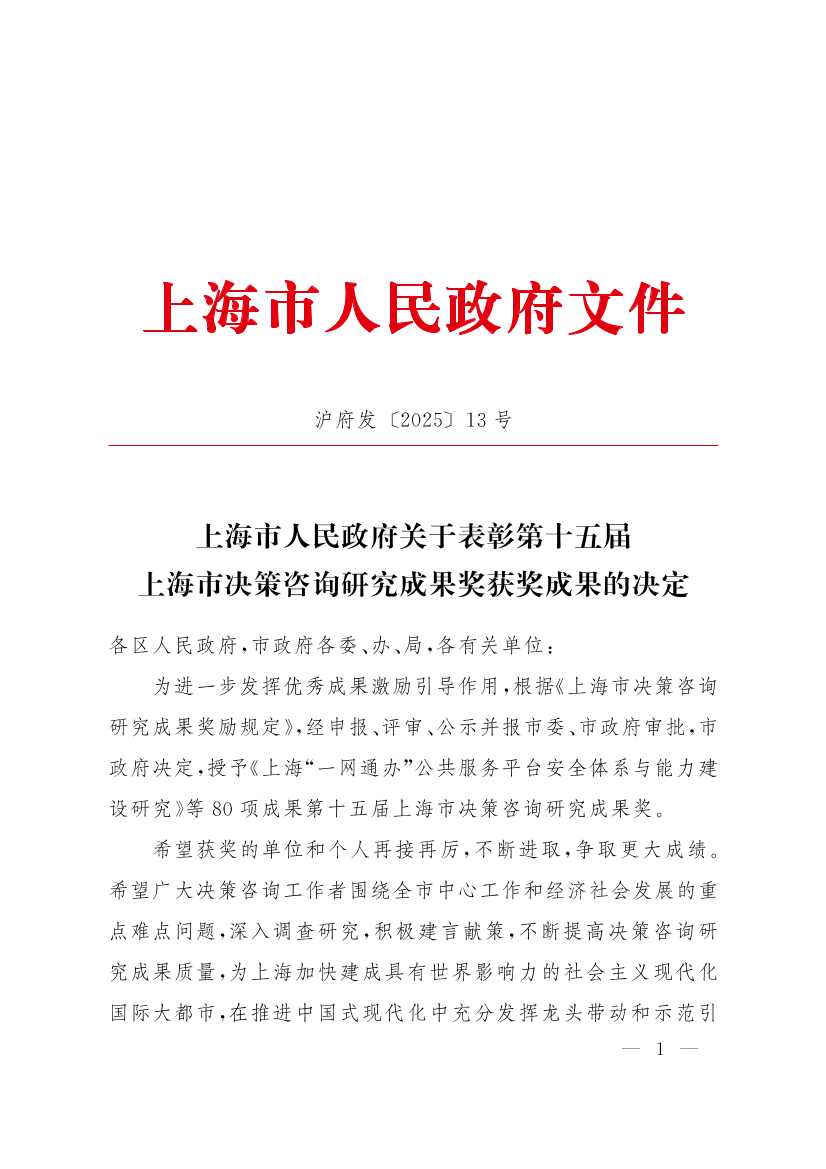 ??為進一步發(fā)揮優(yōu)秀成果激勵引導作用,根據《上海市決策咨詢研究成果獎勵規(guī)定》,經申報、評審、公示并報市委、市政府審批,市政府決定,授予《上海“一網通辦”公共服務平臺安全體系與能力建設研究》等80項成果第十五屆上海市決策咨詢研究成果獎。