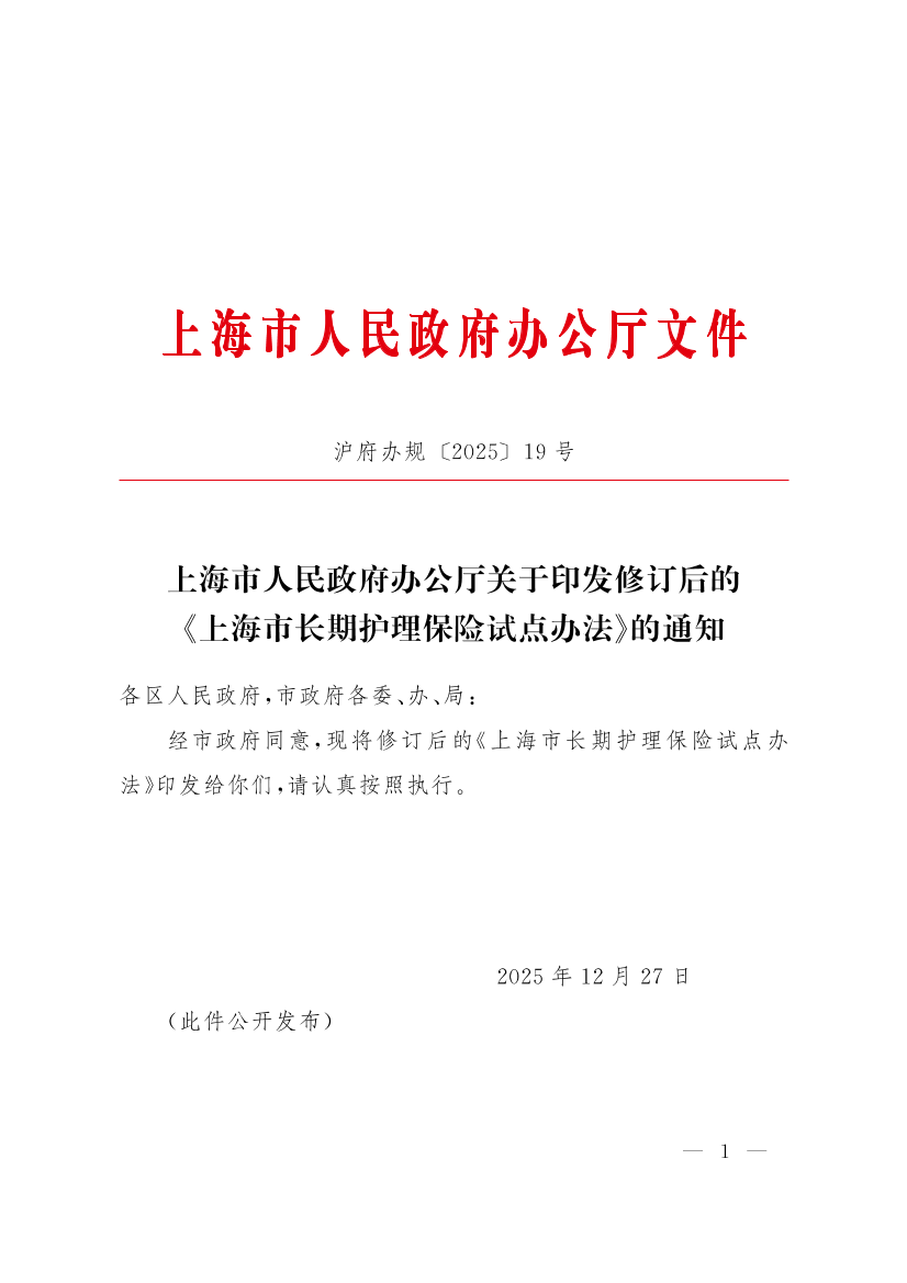 上海市人民政府辦公廳關(guān)于印發(fā)修訂后的《上海市長期護理保險試點辦法》的通知