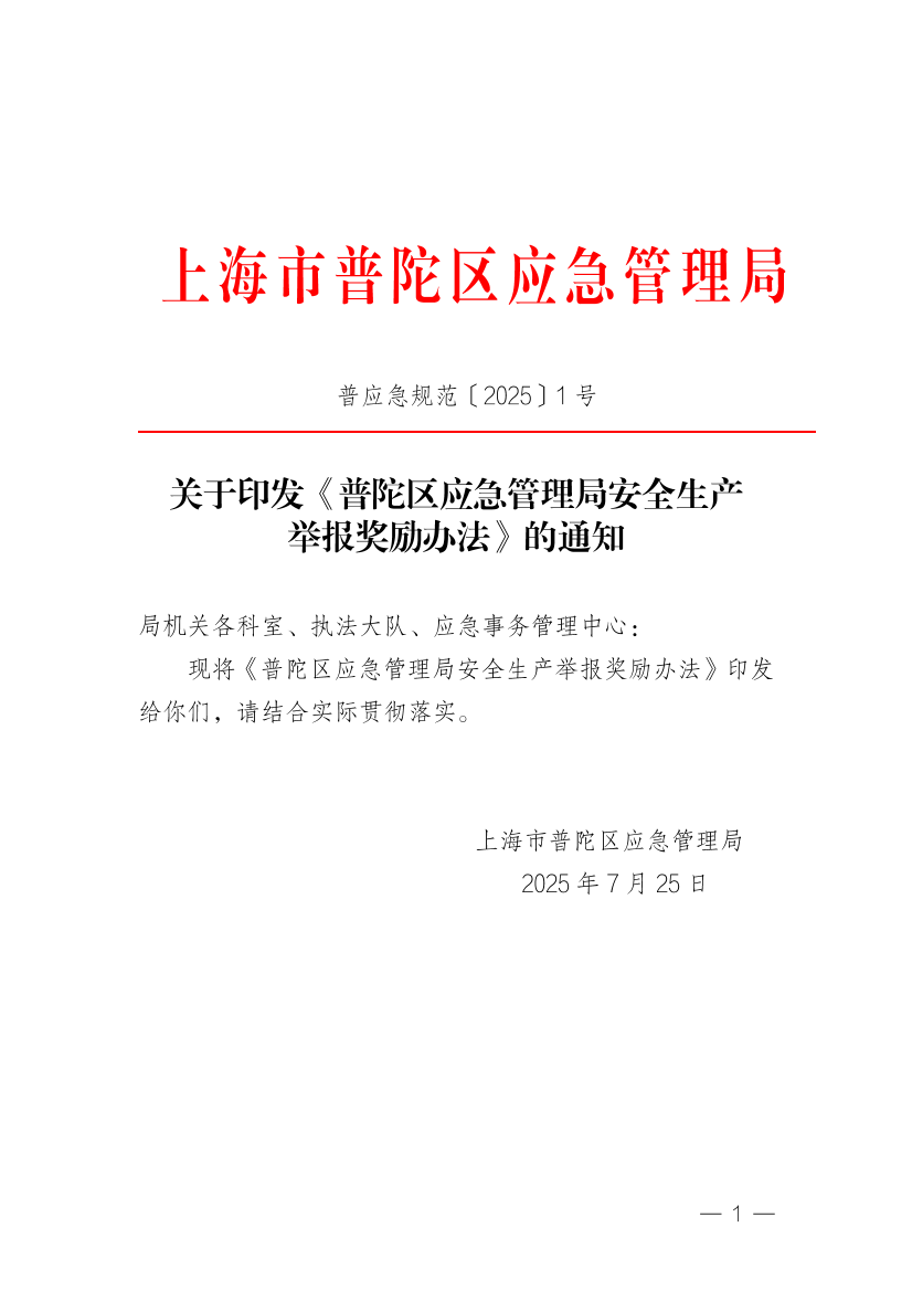 ??現(xiàn)將《普陀區(qū)應(yīng)急管理局安全生產(chǎn)舉報獎勵辦法》印發(fā)給你們,請結(jié)合實(shí)際貫徹落實(shí)。