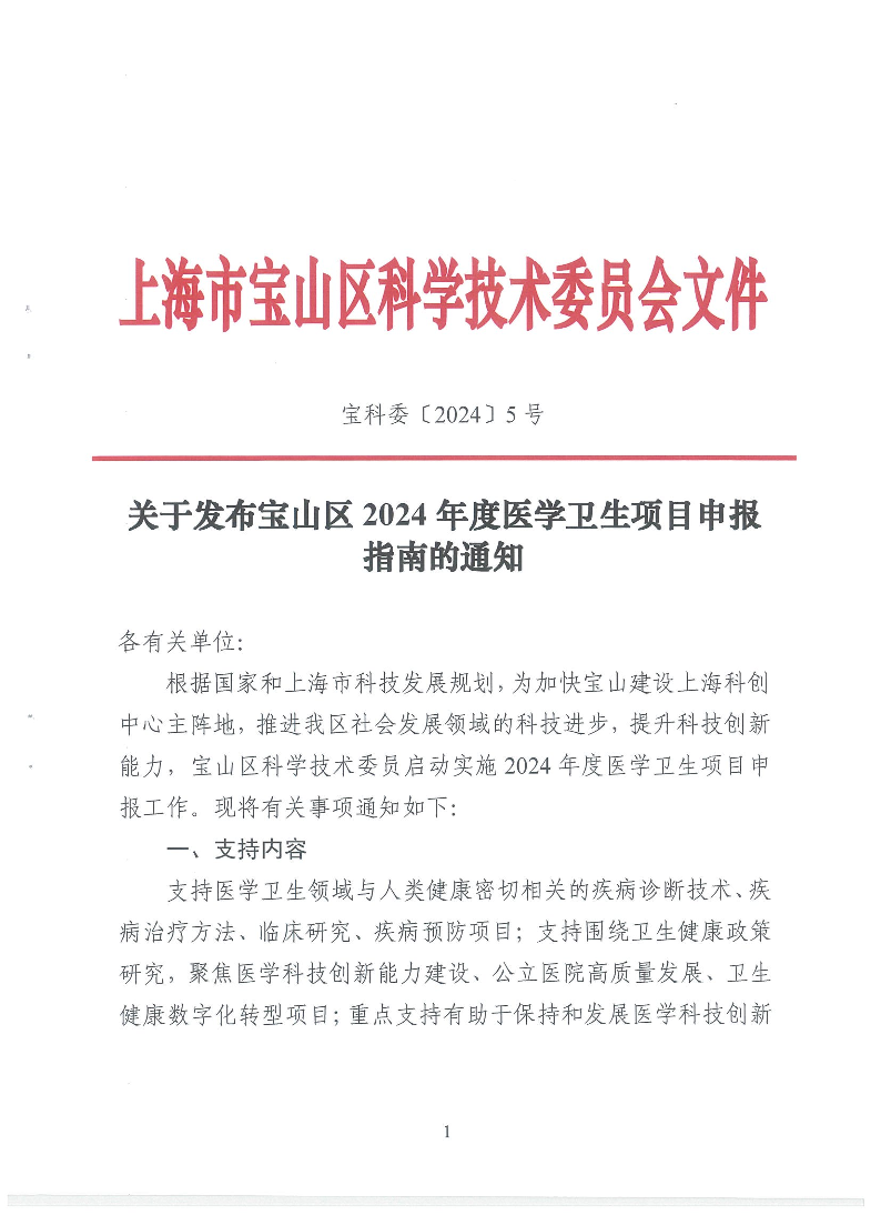 ??根據(jù)國家和上海市科技發(fā)展規(guī)劃,為加快寶山建設(shè)上??苿?chuàng)中心主陣地,推進我區(qū)社會發(fā)展領(lǐng)域的科技進步,提升科技創(chuàng)新能力,寶山區(qū)科學(xué)技術(shù)委員啟動實施2024年度醫(yī)學(xué)衛(wèi)生項目申報工作?,F(xiàn)將有關(guān)事項通知如下: