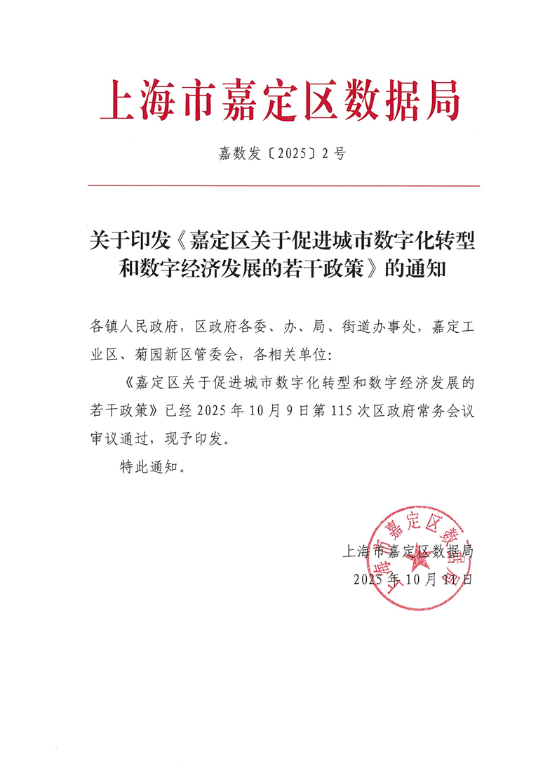 ??《嘉定區(qū)關(guān)于促進(jìn)城市數(shù)字化轉(zhuǎn)型和數(shù)字經(jīng)濟(jì)發(fā)展的若干政策》已經(jīng)2025年10月9日第115次區(qū)政府常務(wù)會(huì)議審議通過,現(xiàn)予印發(fā)。