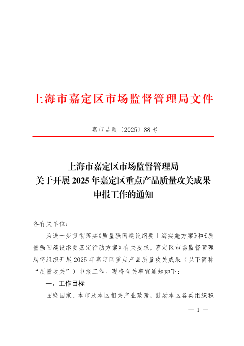 ??為進(jìn)一步貫徹落實《質(zhì)量強(qiáng)國建設(shè)綱要上海實施方案》和《質(zhì)量強(qiáng)國建設(shè)綱要嘉定行動方案》有關(guān)要求,嘉定區(qū)市場監(jiān)督管理局將組織開展2025年嘉定區(qū)重點產(chǎn)品質(zhì)量攻關(guān)成果(以下簡稱“質(zhì)量攻關(guān)”)申報工作?,F(xiàn)將有關(guān)事宜通知如下: