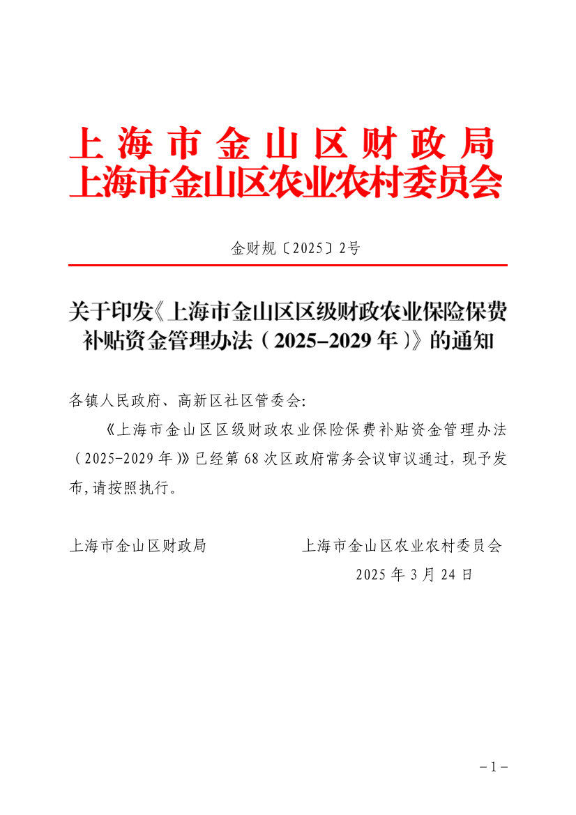 ??《上海市金山區(qū)區(qū)級財(cái)政農(nóng)業(yè)保險保費(fèi)補(bǔ)貼資金管理辦法(2025-2029年)》已經(jīng)第68次區(qū)政府常務(wù)會議審議通過,現(xiàn)予發(fā)布,請按照執(zhí)行。