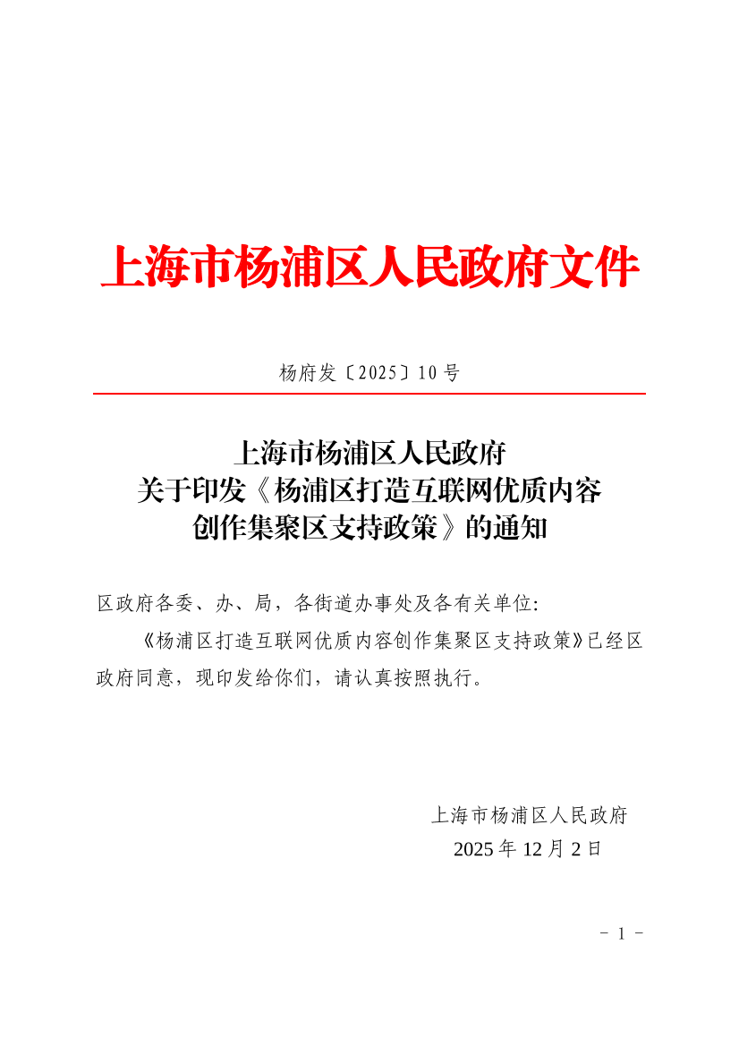 ??《楊浦區(qū)打造互聯(lián)網(wǎng)優(yōu)質(zhì)內(nèi)容創(chuàng)作集聚區(qū)支持政策》已經(jīng)區(qū)政府同意,現(xiàn)印發(fā)給你們,請認真按照執(zhí)行。