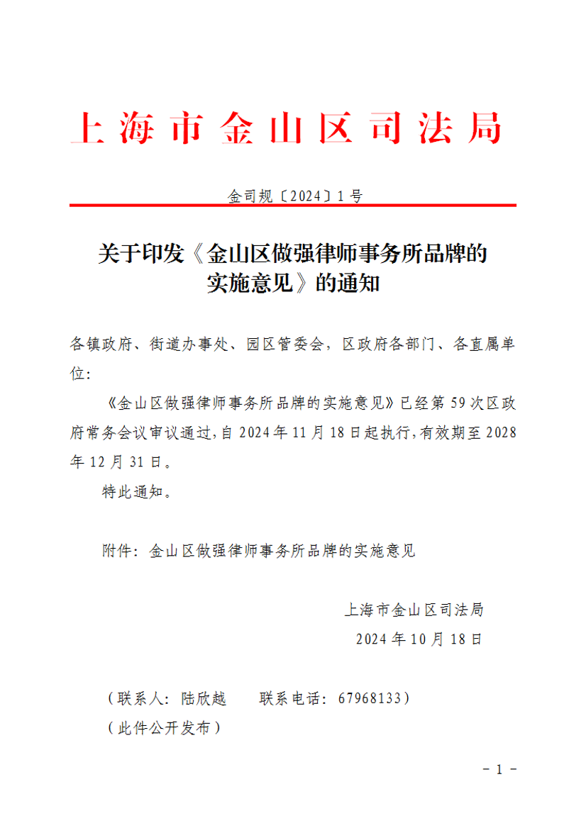 ??《金山區(qū)做強律師事務所品牌的實施意見》已經(jīng)第59次區(qū)政府常務會議審議通過,自2024年11月18日起執(zhí)行,有效期至2028年12月31日。