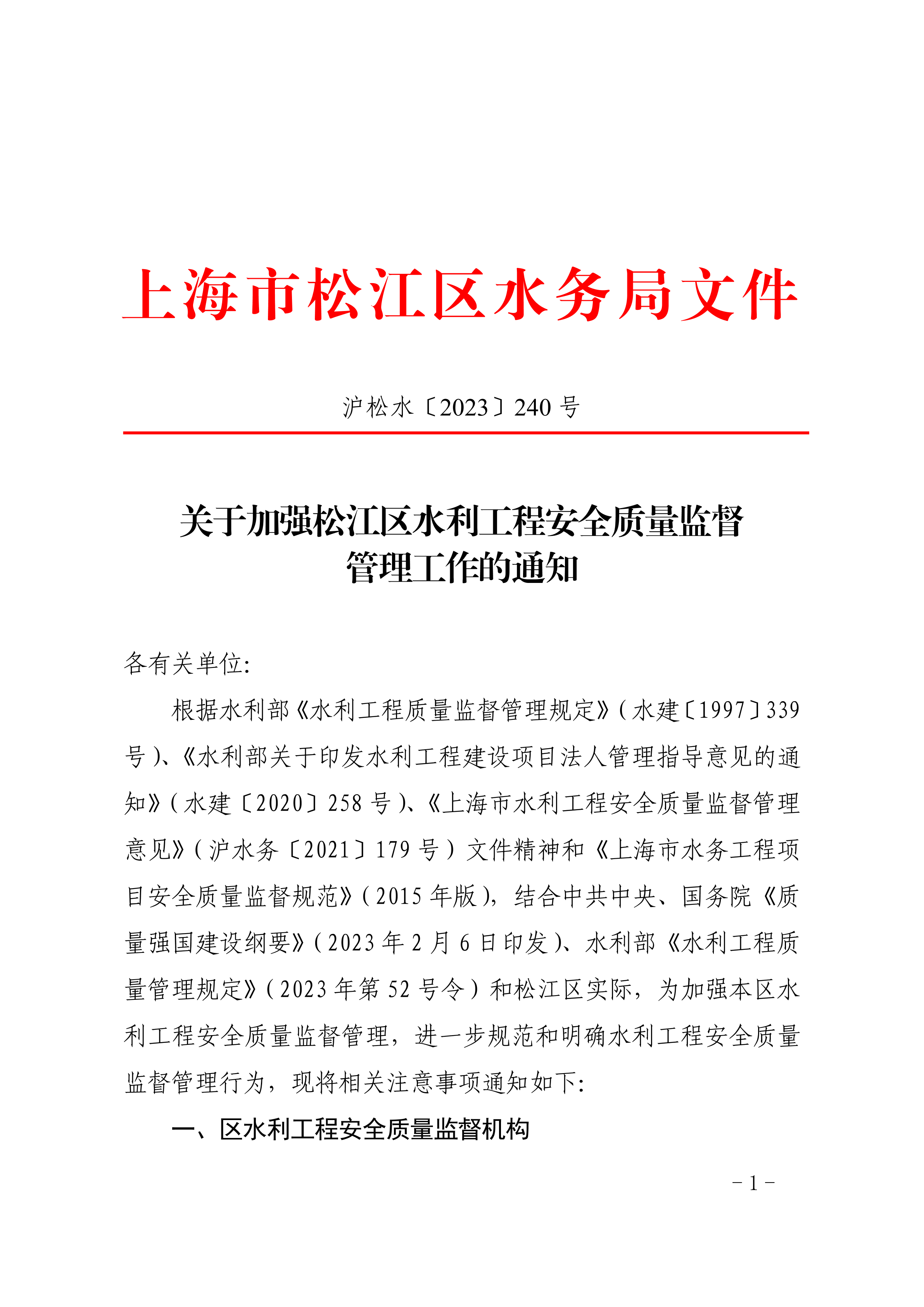關(guān)于加強(qiáng)松江區(qū)水利工程安全質(zhì)量監(jiān)督管理工作的通知