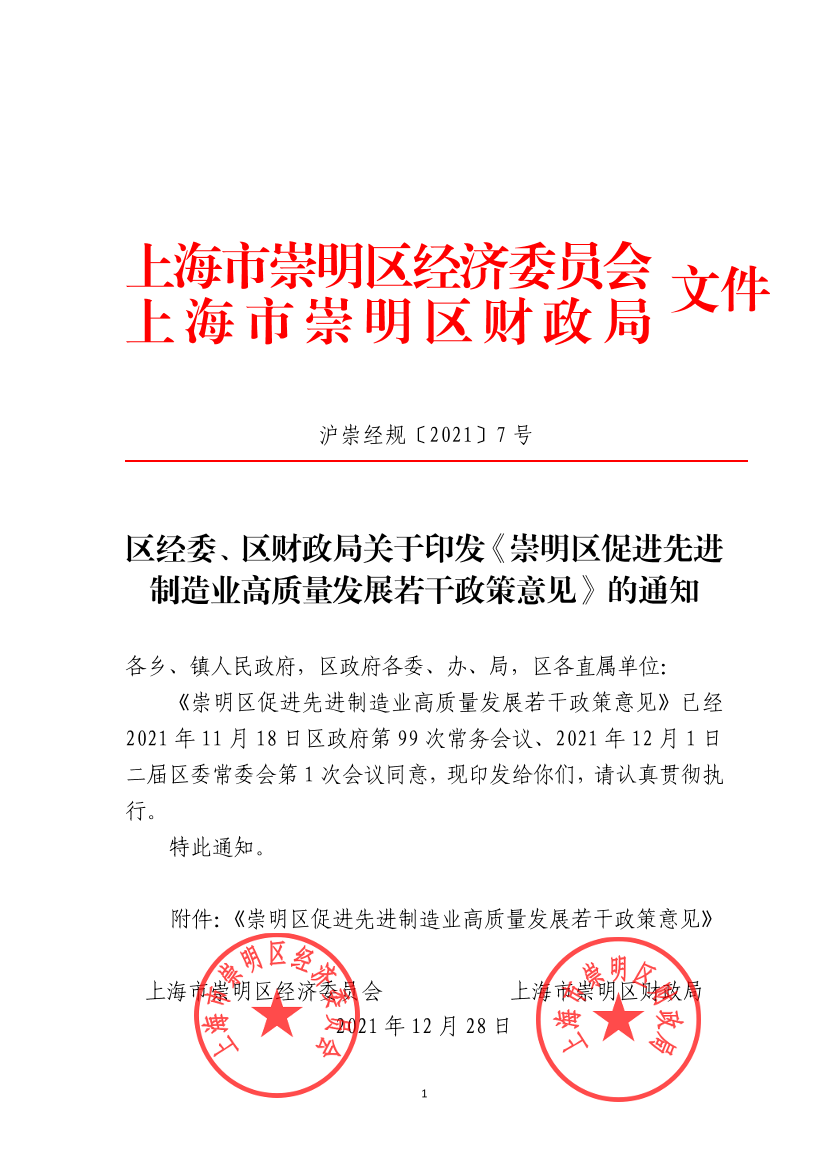 ??《崇明區(qū)促進先進制造業(yè)高質(zhì)量發(fā)展若干政策意見》已經(jīng)2021年11月18日區(qū)政府第99次常務(wù)會議、2021年12月1日二屆區(qū)委常委會第1次會議同意,現(xiàn)印發(fā)給你們,請認(rèn)真貫徹執(zhí)行。