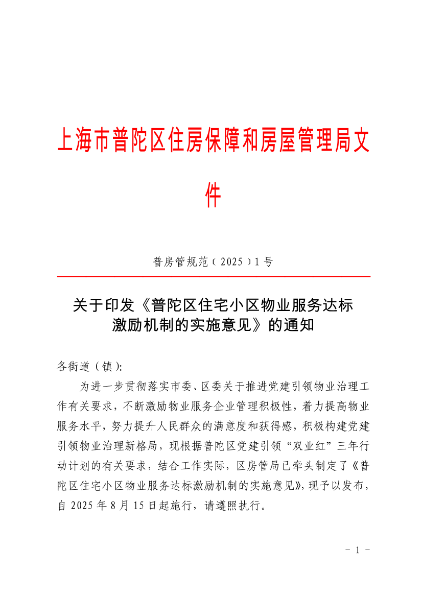 ??為進一步貫徹落實市委、區(qū)委關于推進黨建引領物業(yè)治理工作有關要求,不斷激勵物業(yè)服務企業(yè)管理積極性,著力提高物業(yè)服務水平,努力提升人民群眾的滿意度和獲得感,積極構建黨建引領物業(yè)治理新格局,現(xiàn)根據(jù)普陀區(qū)黨建引領“雙業(yè)紅”三年行動計劃的有關要求,結(jié)合工作實際,區(qū)房管局已牽頭制定了《普陀區(qū)住宅小區(qū)物業(yè)服務達標激勵機制的實施意見》,現(xiàn)予以發(fā)布,自2025年8月15日起施行,請遵照執(zhí)行。