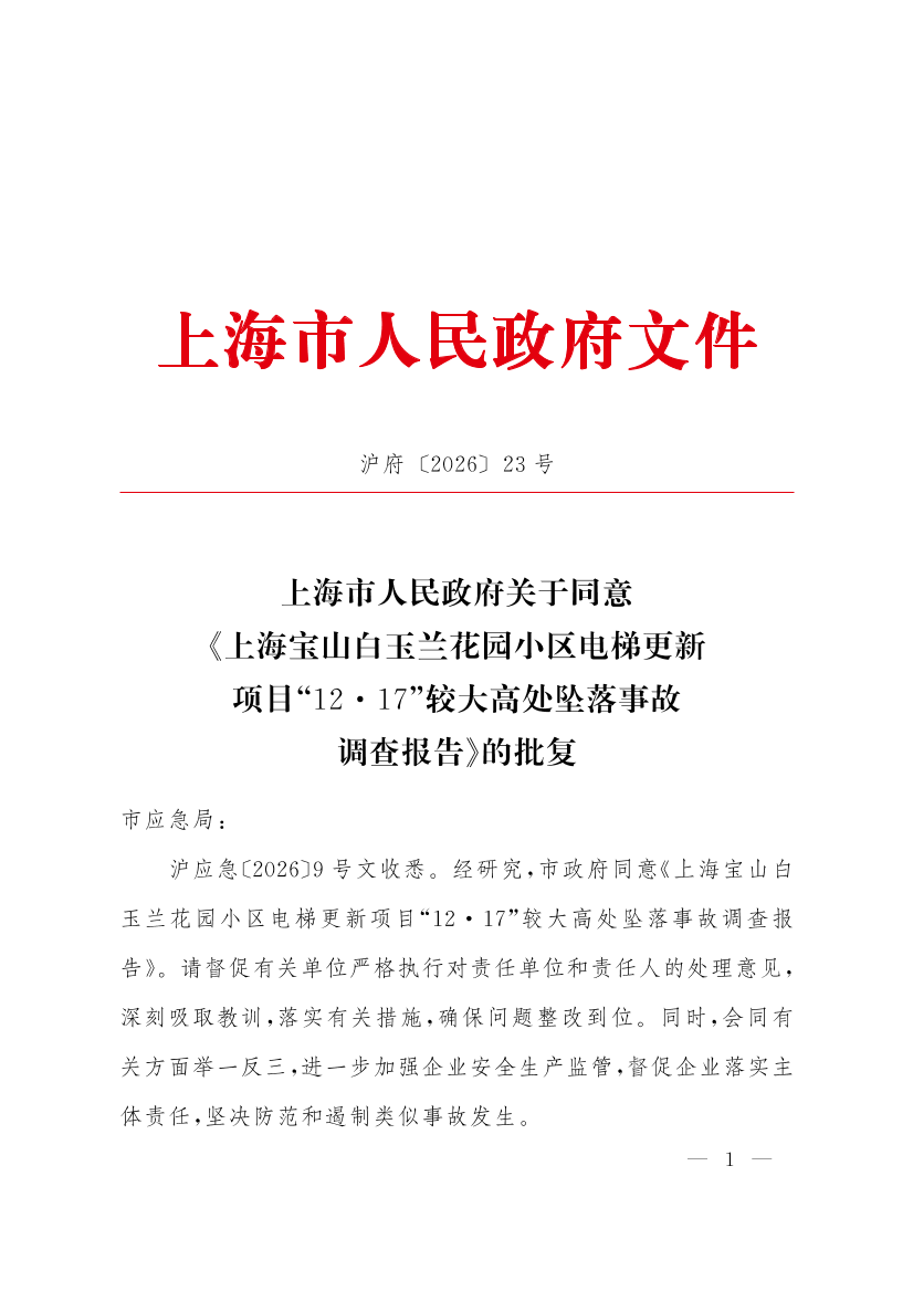 ??滬應(yīng)急〔2026〕9號(hào)文收悉。經(jīng)研究,市政府同意《上海寶山白玉蘭花園小區(qū)電梯更新項(xiàng)目“12·17”較大高處墜落事故調(diào)查報(bào)告》。請(qǐng)督促有關(guān)單位嚴(yán)格執(zhí)行對(duì)責(zé)任單位和責(zé)任人的處理意見,深刻吸取教訓(xùn),落實(shí)有關(guān)措施,確保問題整改到位。同時(shí),會(huì)同有關(guān)方面舉一反三,進(jìn)一步加強(qiáng)企業(yè)安全生產(chǎn)監(jiān)管,督促企業(yè)落實(shí)主體責(zé)任,堅(jiān)決防范和遏制類似事故發(fā)生。