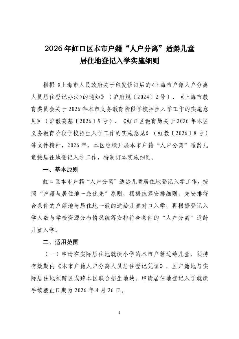 ??根據(jù)《上海市人民政府關(guān)于印發(fā)修訂后的<上海市戶籍人戶分離人員居住登記辦法>的通知》(滬府規(guī)〔2024〕2號)、《上海市教育委員會關(guān)于2026年本市義務(wù)教育階段學(xué)校招生入學(xué)工作的實施意見》(滬教委基〔2026〕9號)、《虹口區(qū)教育局關(guān)于2026年本區(qū)義務(wù)教育階段學(xué)校招生入學(xué)工作的實施意見》(虹教〔2026〕8號)等文件精神,2026年,本區(qū)繼續(xù)開展本市戶籍“人戶分離”適齡兒童按居住地登記入學(xué)工作,特制訂本實施細則。