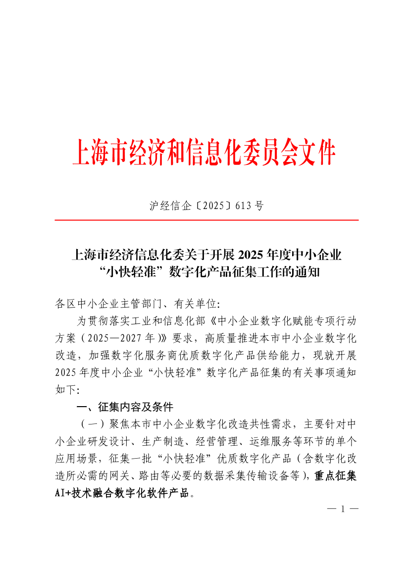 ??為貫徹落實(shí)工業(yè)和信息化部《中小企業(yè)數(shù)字化賦能專項(xiàng)行動(dòng)方案(2025—2027年)》要求,高質(zhì)量推進(jìn)本市中小企業(yè)數(shù)字化改造,加強(qiáng)數(shù)字化服務(wù)商優(yōu)質(zhì)數(shù)字化產(chǎn)品供給能力,現(xiàn)就開(kāi)展2025年度中小企業(yè)“小快輕準(zhǔn)”數(shù)字化產(chǎn)品征集的有關(guān)事項(xiàng)通知如下: