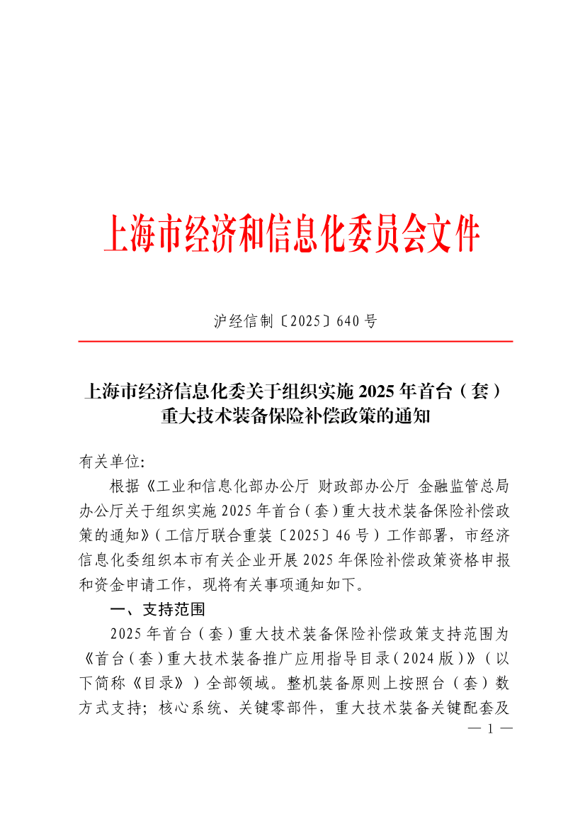 ??根據(jù)《工業(yè)和信息化部辦公廳 財(cái)政部辦公廳 金融監(jiān)管總局辦公廳關(guān)于組織實(shí)施2025年首臺(tái)(套)重大技術(shù)裝備保險(xiǎn)補(bǔ)償政策的通知》(工信廳聯(lián)合重裝〔2025〕46號(hào))工作部署,市經(jīng)濟(jì)信息化委組織本市有關(guān)企業(yè)開(kāi)展2025年保險(xiǎn)補(bǔ)償政策資格申報(bào)和資金申請(qǐng)工作,現(xiàn)將有關(guān)事項(xiàng)通知如下。