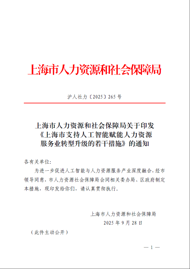 上海市支持人工智能賦能人力資源服務(wù)業(yè)轉(zhuǎn)型升級(jí)的若干措施