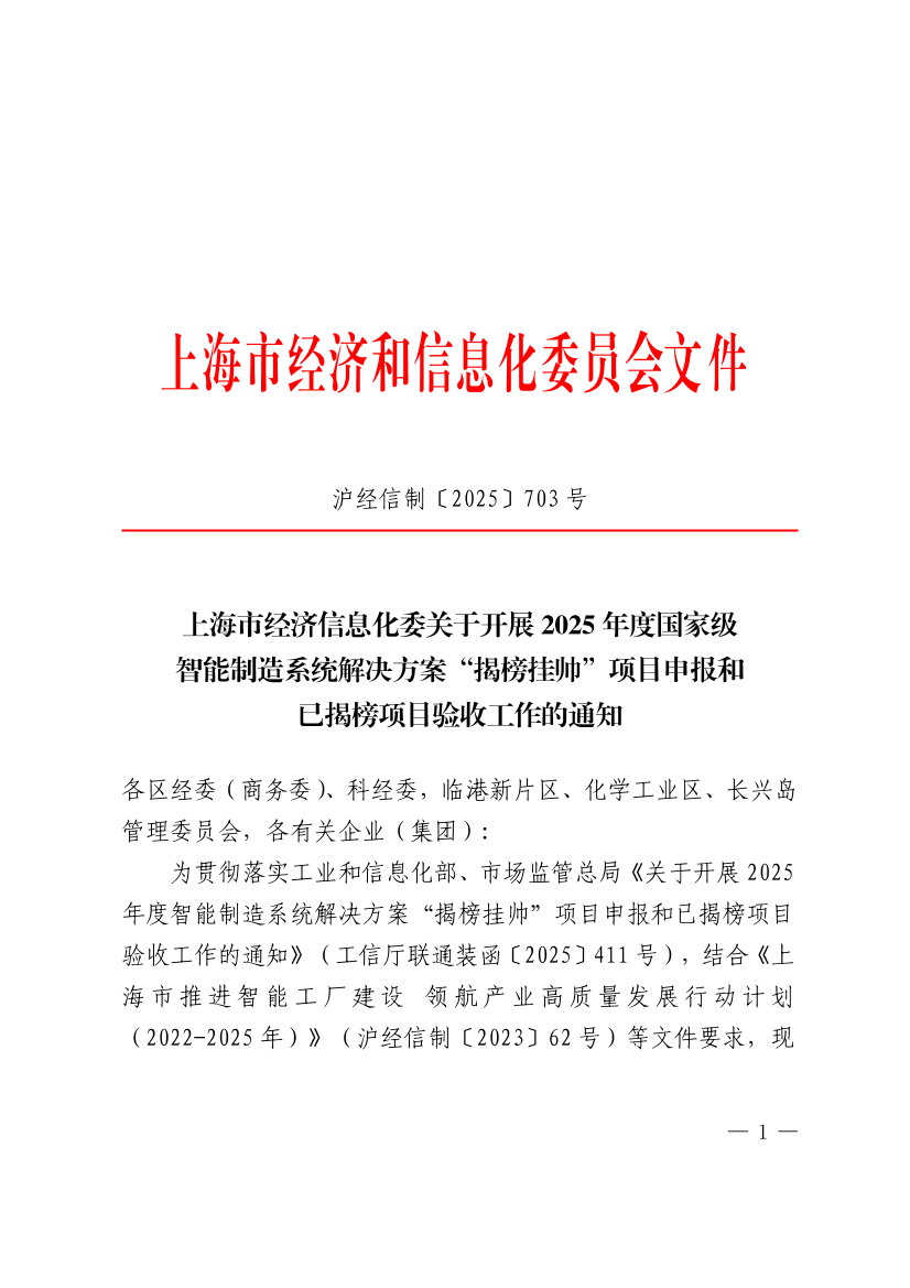 ??為貫徹落實工業(yè)和信息化部、市場監(jiān)管總局《關(guān)于開展2025年度智能制造系統(tǒng)解決方案“揭榜掛帥”項目申報和已揭榜項目驗收工作的通知》(工信廳聯(lián)通裝函〔2025〕411號),結(jié)合《上海市推進(jìn)智能工廠建設(shè) 領(lǐng)航產(chǎn)業(yè)高質(zhì)量發(fā)展行動計劃(2022-2025年)》(滬經(jīng)信制〔2023〕62號)等文件要求,現(xiàn)啟動2025年度國家級智能制造系統(tǒng)解決方案“揭榜掛帥”項目申報和已揭榜項目驗收工作,具體通知如下:
