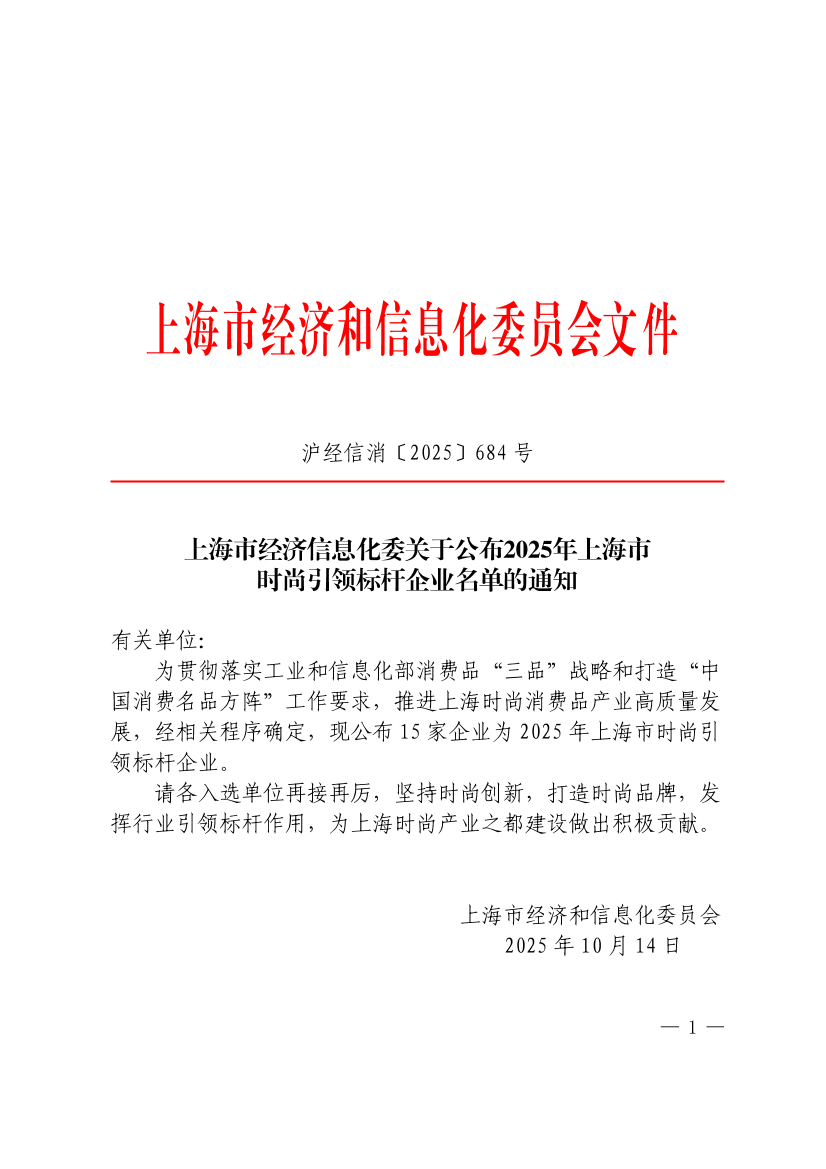 ??為貫徹落實工業(yè)和信息化部消費品“三品”戰(zhàn)略和打造“中國消費名品方陣”工作要求,推進上海時尚消費品產(chǎn)業(yè)高質(zhì)量發(fā)展,經(jīng)相關(guān)程序確定,現(xiàn)公布15家企業(yè)為2025年上海市時尚引領(lǐng)標(biāo)桿企業(yè)。