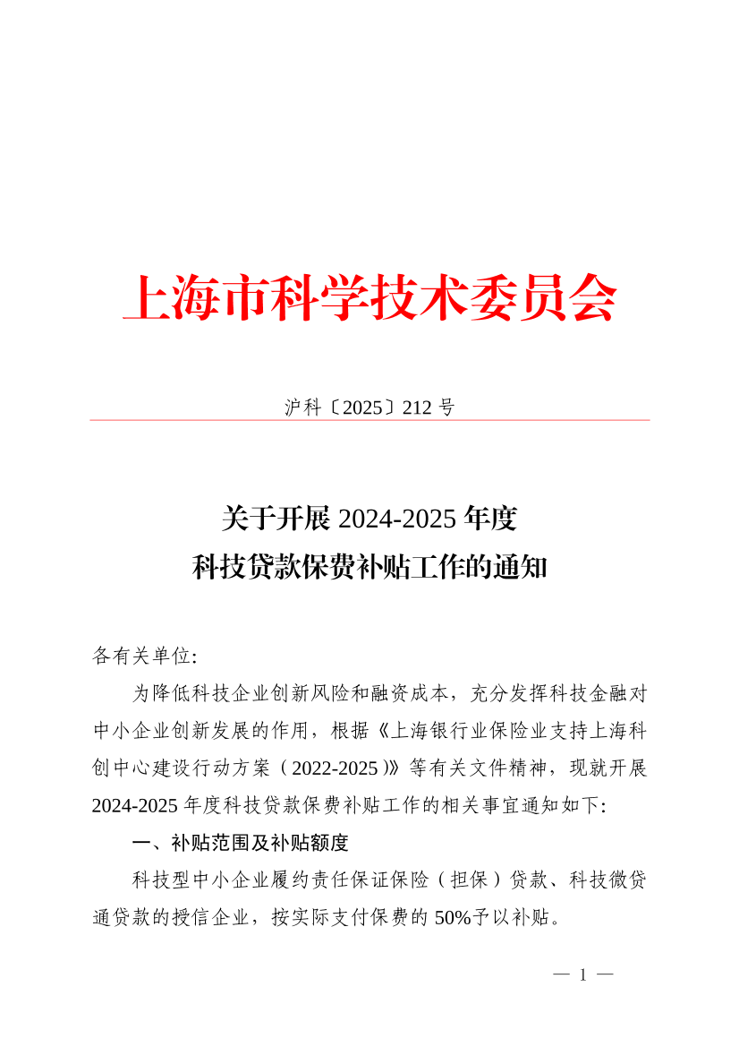 ??為降低科技企業(yè)創(chuàng)新風(fēng)險和融資成本,充分發(fā)揮科技金融對中小企業(yè)創(chuàng)新發(fā)展的作用,根據(jù)《上海銀行業(yè)保險業(yè)支持上??苿?chuàng)中心建設(shè)行動方案(2022-2025)》等有關(guān)文件精神,現(xiàn)就開展2024-2025年度科技貸款保費(fèi)補(bǔ)貼工作的相關(guān)事宜通知如下: