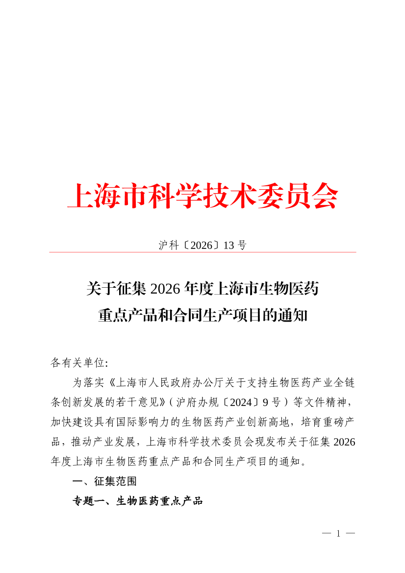 ??為落實(shí)《上海市人民政府辦公廳關(guān)于支持生物醫(yī)藥產(chǎn)業(yè)全鏈條創(chuàng)新發(fā)展的若干意見(jiàn)》(滬府辦規(guī)〔2024〕9號(hào))等文件精神,加快建設(shè)具有國(guó)際影響力的生物醫(yī)藥產(chǎn)業(yè)創(chuàng)新高地,培育重磅產(chǎn)品,推動(dòng)產(chǎn)業(yè)發(fā)展,上海市科學(xué)技術(shù)委員會(huì)現(xiàn)發(fā)布關(guān)于征集2026年度上海市生物醫(yī)藥重點(diǎn)產(chǎn)品和合同生產(chǎn)項(xiàng)目的通知。