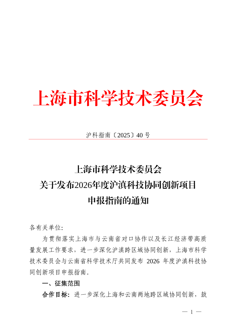 ??為貫徹落實(shí)上海市與云南省對(duì)口協(xié)作以及長(zhǎng)江經(jīng)濟(jì)帶高質(zhì)量發(fā)展工作要求,進(jìn)一步深化滬滇跨區(qū)域協(xié)同創(chuàng)新,上海市科學(xué)技術(shù)委員會(huì)與云南省科學(xué)技術(shù)廳共同發(fā)布2026年度滬滇科技協(xié)同創(chuàng)新項(xiàng)目申報(bào)指南。