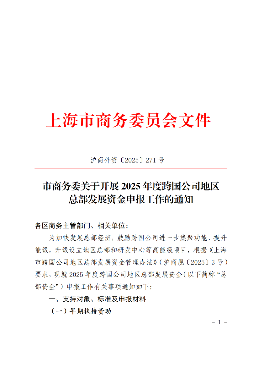 ??為加快發(fā)展總部經(jīng)濟,鼓勵跨國公司進一步集聚功能、提升能級,升級設(shè)立地區(qū)總部和研發(fā)中心等高能級項目,根據(jù)《上海市跨國公司地區(qū)總部發(fā)展資金管理辦法》(滬商規(guī)〔2025〕3號)要求,現(xiàn)就2025年度跨國公司地區(qū)總部發(fā)展資金(以下簡稱“總部資金”)申報工作有關(guān)事項通知如下: