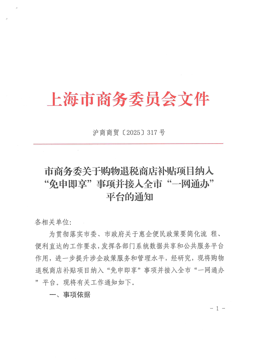 ??為貫徹落實(shí)市委、市政府關(guān)于惠企便民政策要簡(jiǎn)化流 程、便利直達(dá)的工作要求,發(fā)揮各部門系統(tǒng)數(shù)據(jù)共享和公共服務(wù)平臺(tái)作用,進(jìn)一步提升涉企政策服務(wù)和管理水平,經(jīng)研究,現(xiàn)將購物退稅商店補(bǔ)貼項(xiàng)目納入“免申即享”事項(xiàng)并接入全市“一網(wǎng)通辦”平臺(tái)。現(xiàn)將有關(guān)工作通知如下。