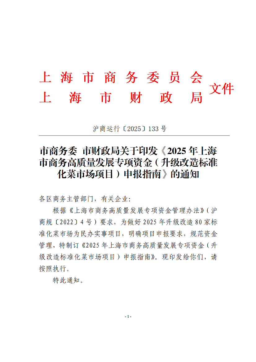 ??為進(jìn)一步貫徹落實《中共上海市委辦公廳 上海市人民政府辦公廳印發(fā)〈2025年上海市為民辦實事項目〉的通知》(滬委辦〔2025〕3號)《市商務(wù)委關(guān)于印發(fā)〈2025年上海市標(biāo)準(zhǔn)化菜市場升級改造工作方案〉的通知》(滬商運行〔2025〕19號)的有關(guān)要求,有序推進(jìn)我市標(biāo)準(zhǔn)化菜市場升級改造,根據(jù)《上海市商務(wù)高質(zhì)量發(fā)展專項資金管理辦法》(滬商規(guī)〔2022〕4號)制定本申報指南。
