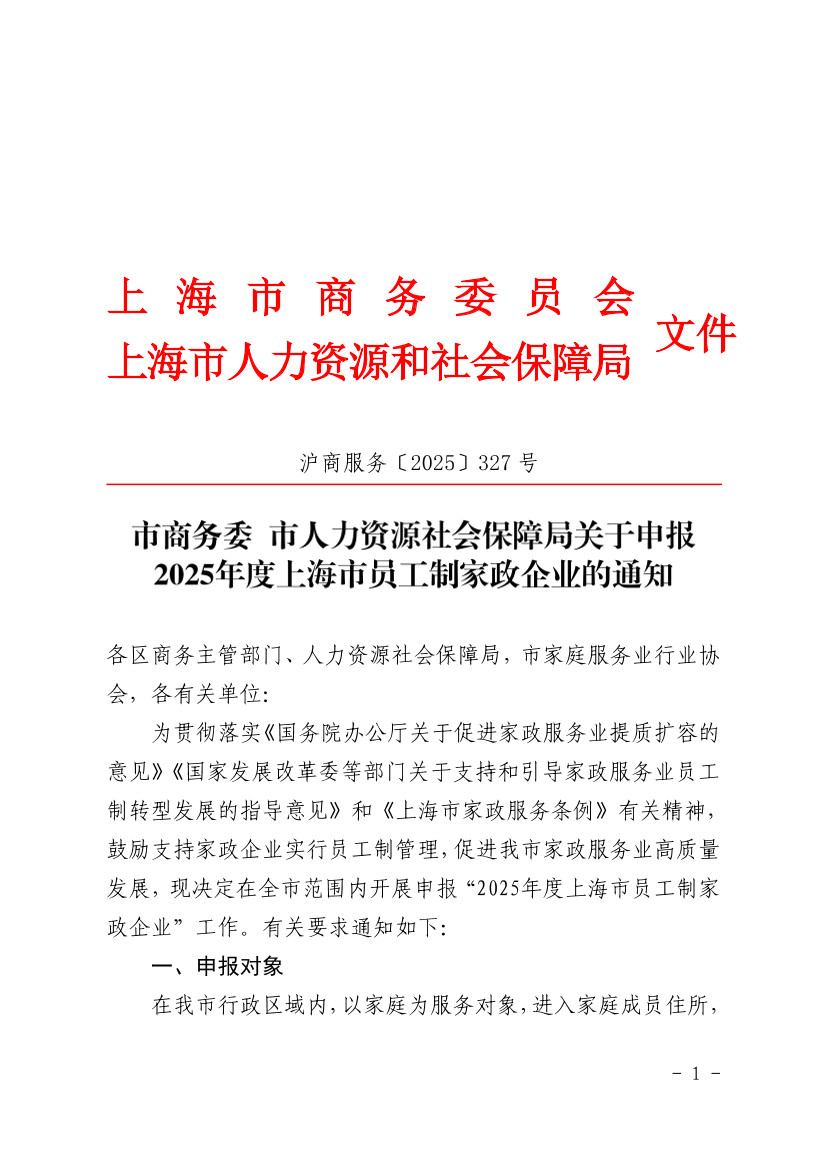 ??為貫徹落實《國務(wù)院辦公廳關(guān)于促進家政服務(wù)業(yè)提質(zhì)擴容的意見》《國家發(fā)展改革委等部門關(guān)于支持和引導家政服務(wù)業(yè)員工制轉(zhuǎn)型發(fā)展的指導意見》和《上海市家政服務(wù)條例》有關(guān)精神,鼓勵支持家政企業(yè)實行員工制管理,促進我市家政服務(wù)業(yè)高質(zhì)量發(fā)展,現(xiàn)決定在全市范圍內(nèi)開展申報“2025年度上海市員工制家政企業(yè)”工作。有關(guān)要求通知如下: