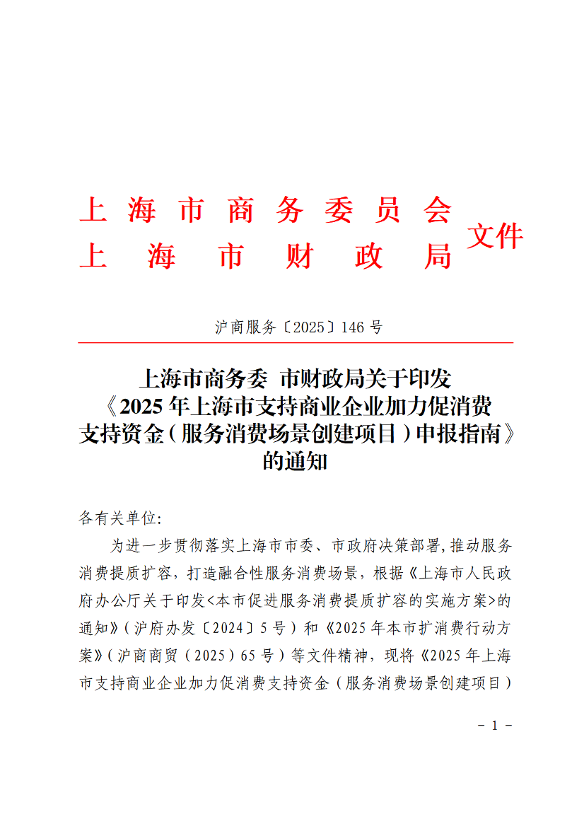 ??為進(jìn)一步貫徹落實(shí)上海市市委、市政府決策部署,推動服務(wù)消費(fèi)提質(zhì)擴(kuò)容,打造融合性服務(wù)消費(fèi)場景,根據(jù)《上海市人民政府辦公廳關(guān)于印發(fā)<本市促進(jìn)服務(wù)消費(fèi)提質(zhì)擴(kuò)容的實(shí)施方案>的通知》(滬府辦發(fā)〔2024〕5號)和《2025年本市擴(kuò)消費(fèi)行動方案》(滬商商貿(mào)(2025)65號)等文件精神,現(xiàn)將《2025年上海市支持商業(yè)企業(yè)加力促消費(fèi)支持資金(服務(wù)消費(fèi)場景創(chuàng)建項(xiàng)目)申報(bào)指南》印發(fā)給你們,請按照要求做好相關(guān)申報(bào)工作。