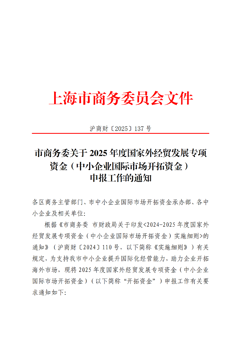 ??根據(jù)《市商務(wù)委 市財(cái)政局關(guān)于印發(fā)<2024-2025年度國家外經(jīng)貿(mào)發(fā)展專項(xiàng)資金(中小企業(yè)國際市場開拓資金)實(shí)施細(xì)則>的通知》(滬商財(cái)〔2024〕110號,以下簡稱《實(shí)施細(xì)則》)有關(guān)規(guī)定,為支持我市中小企業(yè)提升國際化經(jīng)營能力,助力企業(yè)開拓海外市場,現(xiàn)將2025年度國家外經(jīng)貿(mào)發(fā)展專項(xiàng)資金(中小企業(yè)國際市場開拓資金)(以下簡稱“開拓資金”)申報(bào)工作有關(guān)要求通知如下: