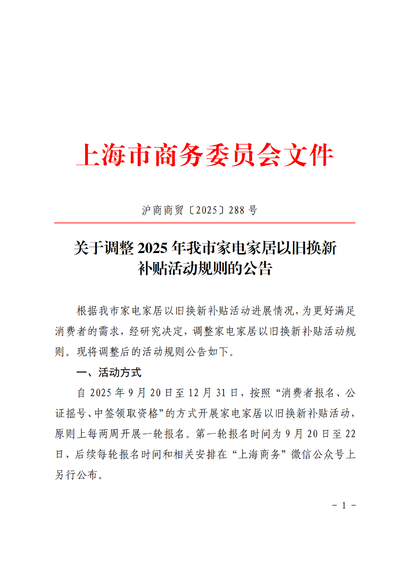 ??本公告內容以外,補貼標準、服務機構相關義務、參與企業(yè)義務等其余事項繼續(xù)按《上海市2025年落實國家家電以舊換新補貼政策實施細則》《上海市2025年落實國家手機、平板、智能手表(手環(huán))購新補貼政策實施細則》《上海市2025年加力支持家電家居家裝消費品補貼政策實施細則》執(zhí)行。如相關事項需調整,將及時公告并按調整后執(zhí)行。本公告由上海市商務委員會負責解釋。