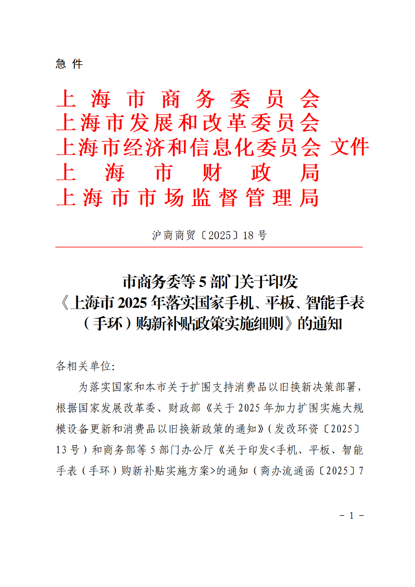 ??為落實國家和本市關(guān)于擴圍支持消費品以舊換新決策部署,根據(jù)國家發(fā)展改革委、財政部《關(guān)于2025年加力擴圍實施大規(guī)模設(shè)備更新和消費品以舊換新政策的通知》(發(fā)改環(huán)資〔2025〕13號)和商務(wù)部等5部門辦公廳《關(guān)于印發(fā)<手機、平板、智能手表(手環(huán))購新補貼實施方案>的通知(商辦流通函〔2025〕7號)要求,現(xiàn)印發(fā)《上海市2025年落實國家手機、平板、智能手表(手環(huán))購新補貼政策實施細則》,請認真貫徹執(zhí)行。