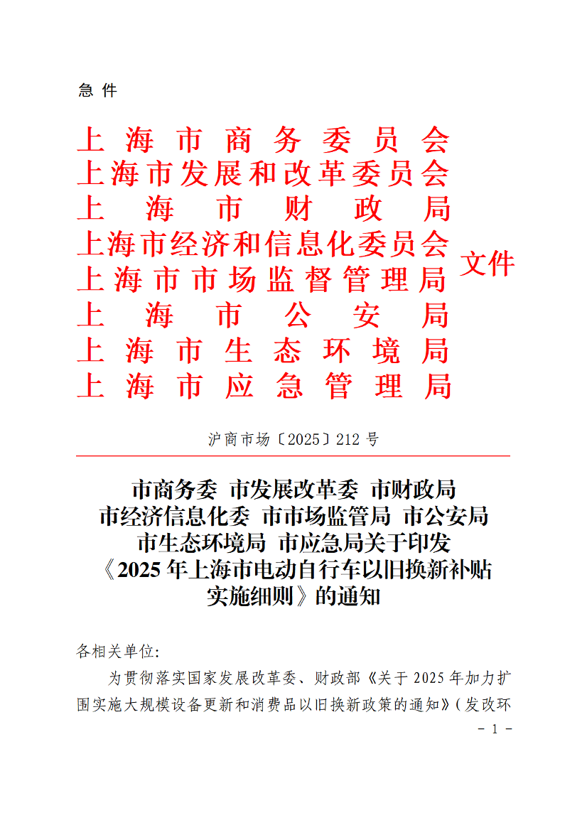 ??為貫徹落實(shí)國家發(fā)展改革委、財(cái)政部《關(guān)于2025年加力擴(kuò)圍實(shí)施大規(guī)模設(shè)備更新和消費(fèi)品以舊換新政策的通知》(發(fā)改環(huán)資〔2025〕13號(hào))、《商務(wù)部等5部門辦公廳(室)關(guān)于做好2025年度電動(dòng)自行車以舊換新工作的通知》(商辦流通函〔2025〕10號(hào))、《上海市關(guān)于2025年加力擴(kuò)圍推進(jìn)大規(guī)模設(shè)備更新和消費(fèi)品以舊換新工作的實(shí)施方案》(滬發(fā)改環(huán)資〔2025〕21號(hào))等工作要求,現(xiàn)印發(fā)《2025年上海市電動(dòng)自行車以舊換新補(bǔ)貼實(shí)施細(xì)則》,請(qǐng)認(rèn)真貫徹執(zhí)行。