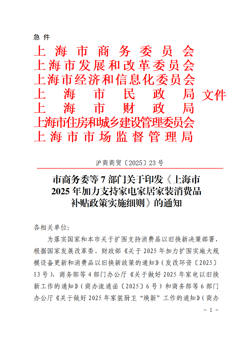 ??為落實(shí)國(guó)家和本市關(guān)于擴(kuò)圍支持消費(fèi)品以舊換新決策部署,根據(jù)國(guó)家發(fā)展改革委、財(cái)政部《關(guān)于2025年加力擴(kuò)圍實(shí)施大規(guī)模設(shè)備更新和消費(fèi)品以舊換新政策的通知》(發(fā)改環(huán)資〔2025〕13號(hào)),商務(wù)部等4部門(mén)辦公廳《關(guān)于做好2025年家電以舊換新工作的通知》(商辦流通函〔2025〕6號(hào))和商務(wù)部等6部門(mén)辦公廳《關(guān)于做好2025年家裝廚衛(wèi)“煥新”工作的通知》(商辦消費(fèi)函〔2025〕29號(hào))要求,現(xiàn)印發(fā)《上海市2025年加力支持家電家居家裝消費(fèi)品補(bǔ)貼政策實(shí)施細(xì)則》,請(qǐng)認(rèn)真貫徹執(zhí)行。