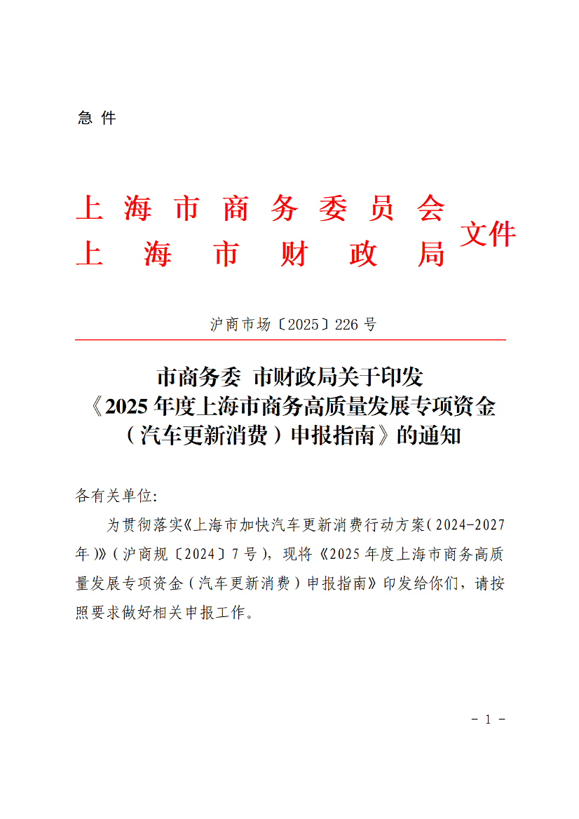??為貫徹落實(shí)《上海市加快汽車更新消費(fèi)行動(dòng)方案(2024-2027年)》(滬商規(guī)〔2024〕7號(hào)),現(xiàn)將《2025年度上海市商務(wù)高質(zhì)量發(fā)展專項(xiàng)資金(汽車更新消費(fèi))申報(bào)指南》印發(fā)給你們,請(qǐng)按照要求做好相關(guān)申報(bào)工作。