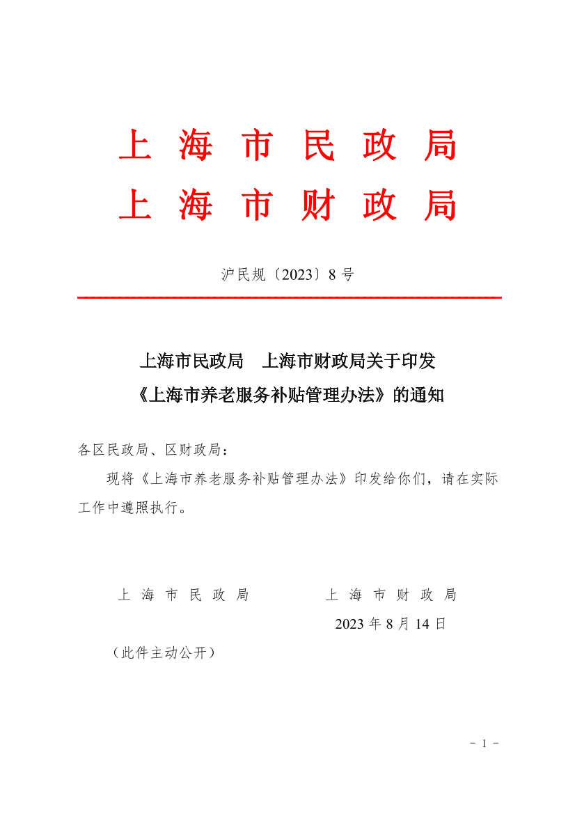 ??現(xiàn)將《上海市養(yǎng)老服務(wù)補(bǔ)貼管理辦法》印發(fā)給你們,請?jiān)趯?shí)際工作中遵照執(zhí)行。