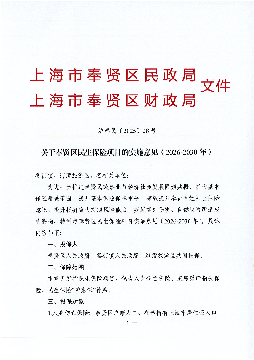 ??為進(jìn)一步推進(jìn)奉賢民政事業(yè)與經(jīng)濟(jì)社會(huì)發(fā)展同頻共振,擴(kuò)大基本保險(xiǎn)覆蓋范圍,提升基本保險(xiǎn)保障水平,有效提升奉賢百姓社會(huì)保險(xiǎn)意識、提升抵御重大疾病風(fēng)險(xiǎn)能力,減輕意外傷害、自然災(zāi)害所造成的影響,特制定奉賢區(qū)民生保險(xiǎn)項(xiàng)目實(shí)施意見(2026-2030年),具體內(nèi)容如下: