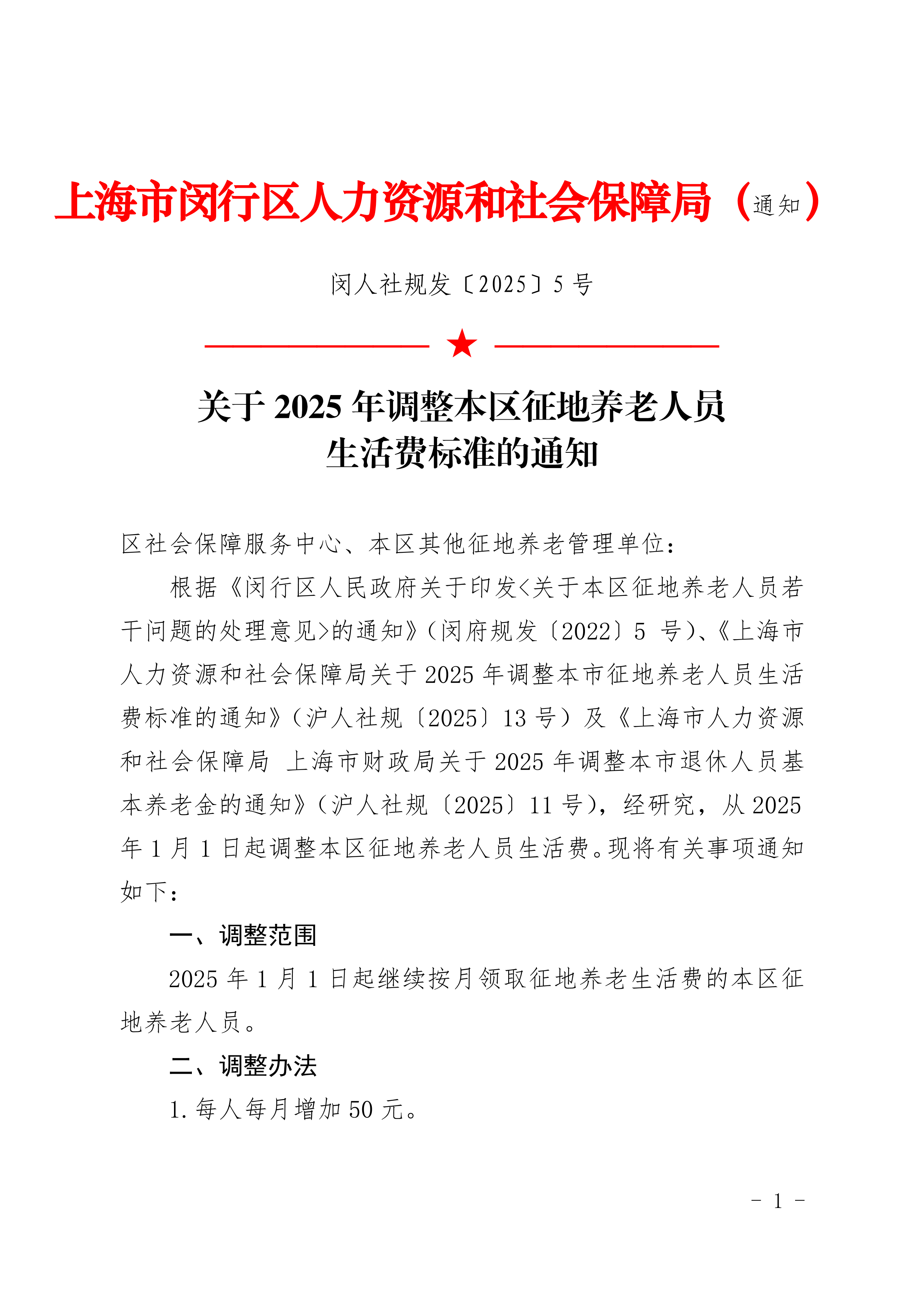 ??根據(jù)《閔行區(qū)人民政府關(guān)于印發(fā)<關(guān)于本區(qū)征地養(yǎng)老人員若干問題的處理意見>的通知》(閔府規(guī)發(fā)〔2022〕5 號)、《上海市人力資源和社會保障局關(guān)于2025年調(diào)整本市征地養(yǎng)老人員生活費標(biāo)準(zhǔn)的通知》(滬人社規(guī)〔2025〕13號)及《上海市人力資源和社會保障局 上海市財政局關(guān)于2025年調(diào)整本市退休人員基本養(yǎng)老金的通知》(滬人社規(guī)〔2025〕11號),經(jīng)研究,從2025年1月1日起調(diào)整本區(qū)征地養(yǎng)老人員生活費。現(xiàn)將有關(guān)事項通知如下: