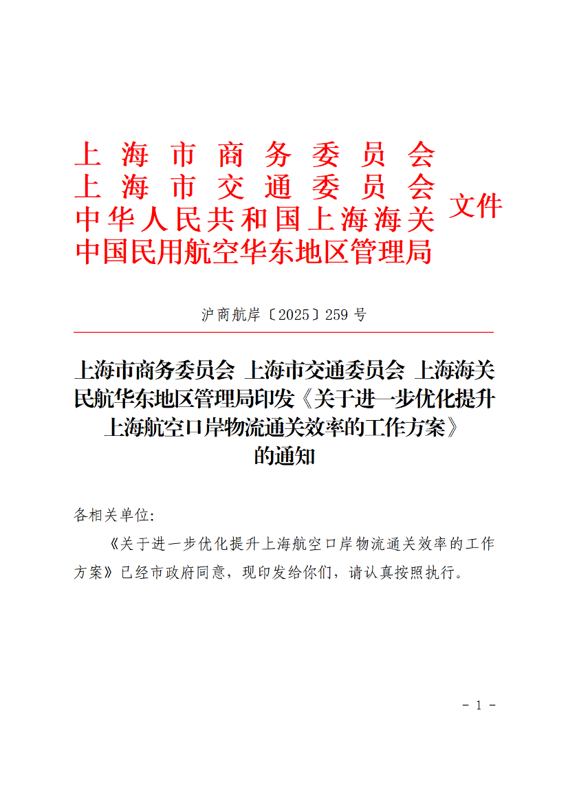 關(guān)于進(jìn)一步優(yōu)化提升上海航空口岸物流通關(guān)效率的工作方案