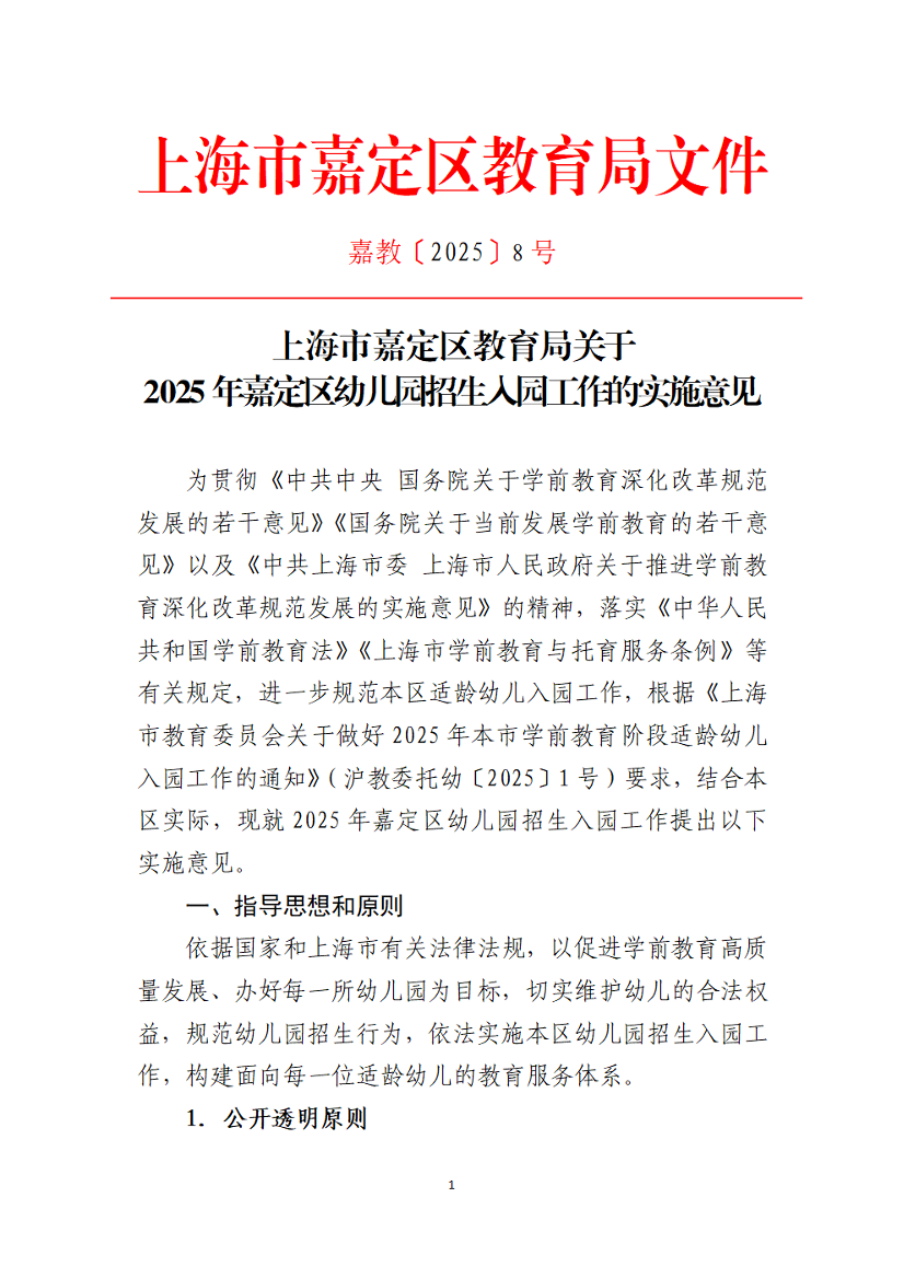 ??為貫徹《中共中央 國務(wù)院關(guān)于學(xué)前教育深化改革規(guī)范發(fā)展的若干意見》《國務(wù)院關(guān)于當(dāng)前發(fā)展學(xué)前教育的若干意見》以及《中共上海市委 上海市人民政府關(guān)于推進(jìn)學(xué)前教育深化改革規(guī)范發(fā)展的實施意見》的精神,落實《中華人民共和國學(xué)前教育法》《上海市學(xué)前教育與托育服務(wù)條例》等有關(guān)規(guī)定,進(jìn)一步規(guī)范本區(qū)適齡幼兒入園工作,根據(jù)《上海市教育委員會關(guān)于做好2025年本市學(xué)前教育階段適齡幼兒入園工作的通知》(滬教委托幼〔2025〕1號)要求,結(jié)合本區(qū)實際,現(xiàn)就2025年嘉定區(qū)幼兒園招生入園工作提出以下實施意見。