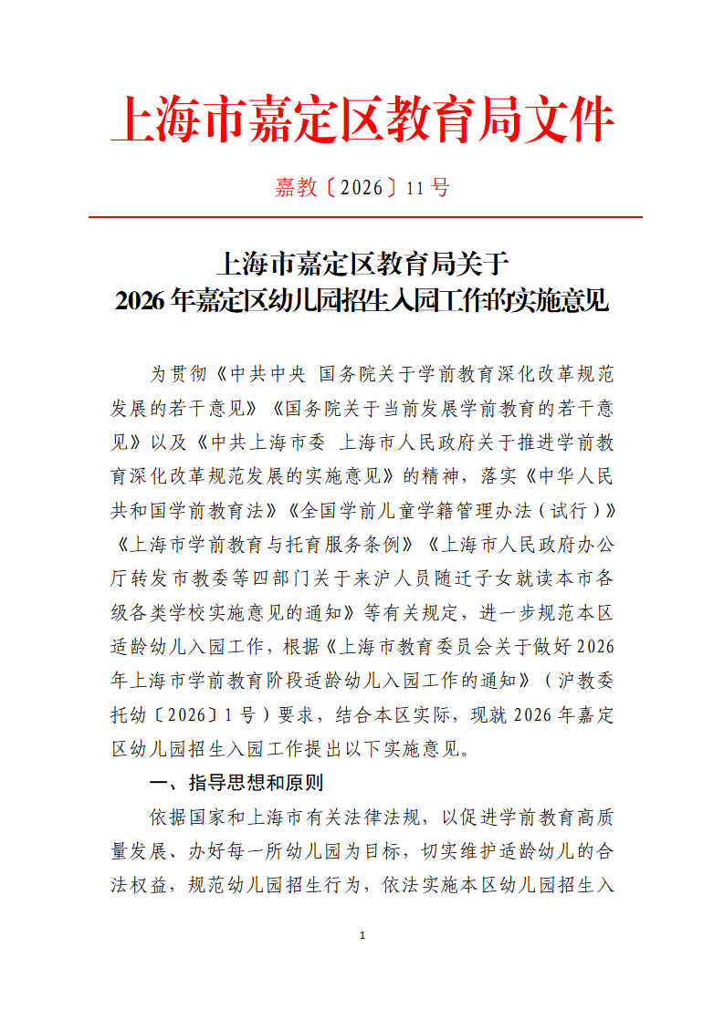 ??為貫徹《中共中央 國(guó)務(wù)院關(guān)于學(xué)前教育深化改革規(guī)范發(fā)展的若干意見(jiàn)》《國(guó)務(wù)院關(guān)于當(dāng)前發(fā)展學(xué)前教育的若干意見(jiàn)》以及《中共上海市委 上海市人民政府關(guān)于推進(jìn)學(xué)前教育深化改革規(guī)范發(fā)展的實(shí)施意見(jiàn)》的精神,落實(shí)《中華人民共和國(guó)學(xué)前教育法》《全國(guó)學(xué)前兒童學(xué)籍管理辦法(試行)》《上海市學(xué)前教育與托育服務(wù)條例》《上海市人民政府辦公廳轉(zhuǎn)發(fā)市教委等四部門關(guān)于來(lái)滬人員隨遷子女就讀本市各級(jí)各類學(xué)校實(shí)施意見(jiàn)的通知》等有關(guān)規(guī)定,進(jìn)一步規(guī)范本區(qū)適齡幼兒入園工作,根據(jù)《上海市教育委員會(huì)關(guān)于做好2026年上海市學(xué)前教育階段適齡幼兒入園工作的通知》(滬教委托幼〔2026〕1號(hào))要求,結(jié)合本區(qū)實(shí)際,現(xiàn)就2026年嘉定區(qū)幼兒園招生入園工作提出以下實(shí)施意見(jiàn)。