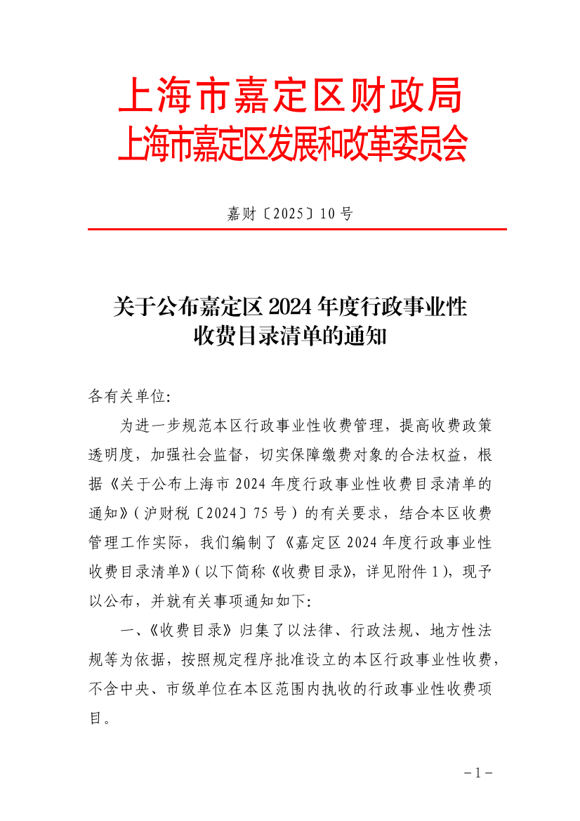 ??關(guān)于公布嘉定區(qū)2024年度行政事業(yè)性收費(fèi)目錄清單的通知