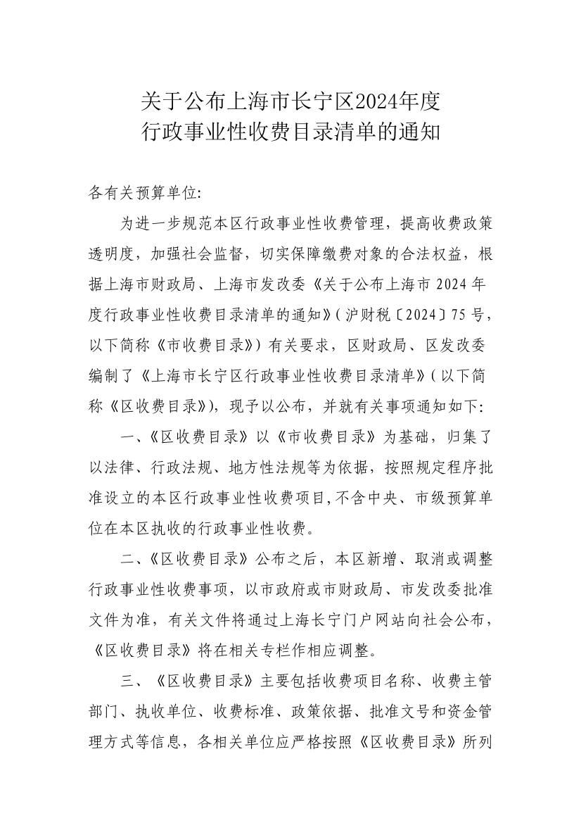 ??為進(jìn)一步規(guī)范本區(qū)行政事業(yè)性收費(fèi)管理,提高收費(fèi)政策透明度,加強(qiáng)社會(huì)監(jiān)督,切實(shí)保障繳費(fèi)對(duì)象的合法權(quán)益,根據(jù)上海市財(cái)政局、上海市發(fā)改委《關(guān)于公布上海市2024年度行政事業(yè)性收費(fèi)目錄清單的通知》(滬財(cái)稅〔2024〕75號(hào),以下簡(jiǎn)稱(chēng)《市收費(fèi)目錄》)有關(guān)要求,區(qū)財(cái)政局、區(qū)發(fā)改委編制了《上海市長(zhǎng)寧區(qū)行政事業(yè)性收費(fèi)目錄清單》(以下簡(jiǎn)稱(chēng)《區(qū)收費(fèi)目錄》),現(xiàn)予以公布,并就有關(guān)事項(xiàng)通知如下: