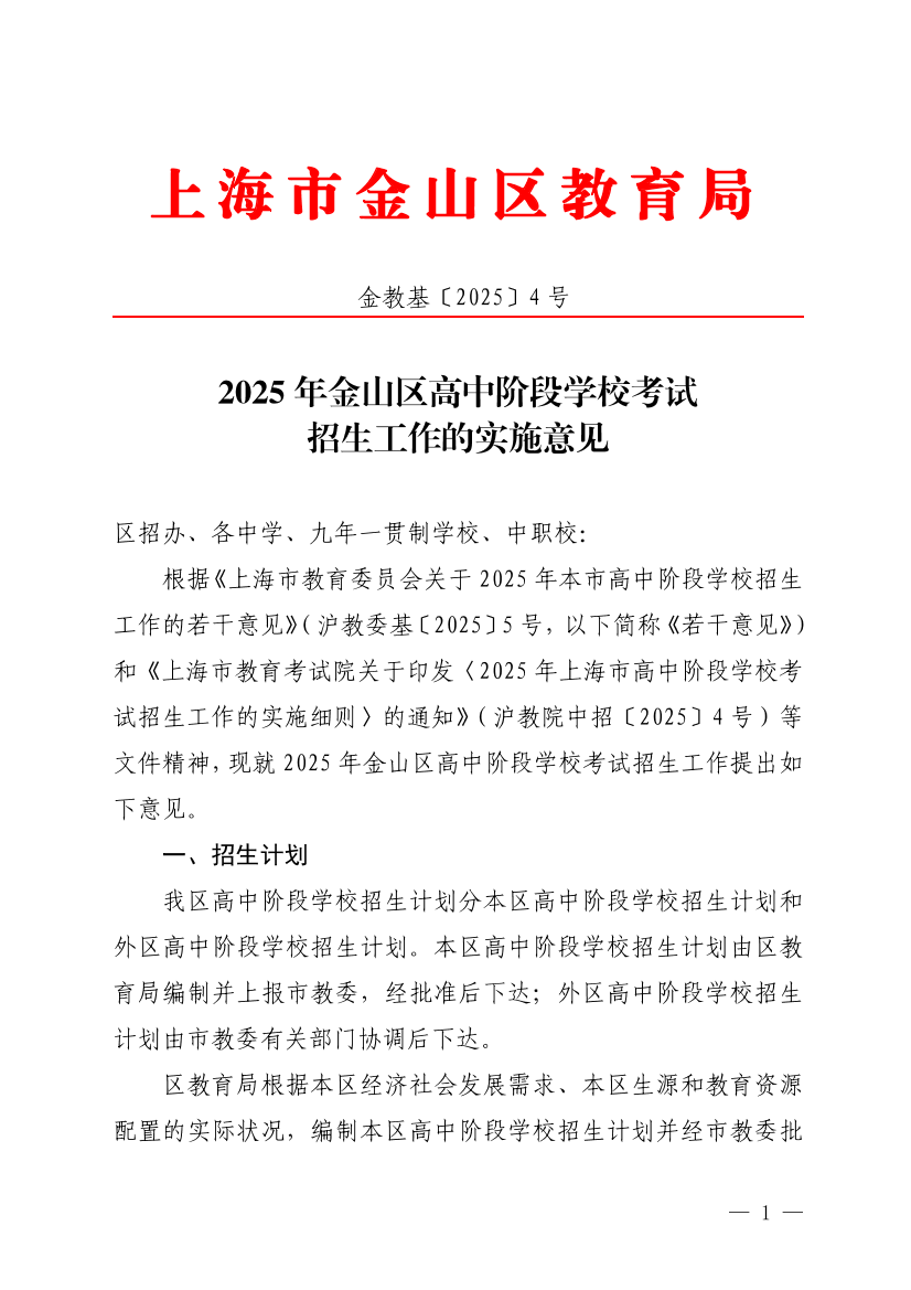 ??根據(jù)《上海市教育委員會(huì)關(guān)于2025年本市高中階段學(xué)校招生工作的若干意見》(滬教委基〔2025〕5號(hào),以下簡(jiǎn)稱《若干意見》)和《上海市教育考試院關(guān)于印發(fā)〈2025年上海市高中階段學(xué)校考試招生工作的實(shí)施細(xì)則〉的通知》(滬教院中招〔2025〕4號(hào))等文件精神,現(xiàn)就2025年金山區(qū)高中階段學(xué)??荚囌猩ぷ魈岢鋈缦乱庖?。