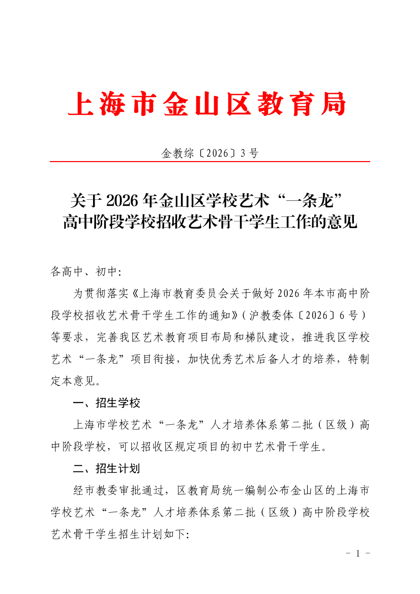??為貫徹落實《上海市教育委員會關(guān)于做好2026年本市高中階段學校招收藝術(shù)骨干學生工作的通知》(滬教委體〔2026〕6號)等要求,完善我區(qū)藝術(shù)教育項目布局和梯隊建設(shè),推進我區(qū)學校藝術(shù)“一條龍”項目銜接,加快優(yōu)秀藝術(shù)后備人才的培養(yǎng),特制定本意見。