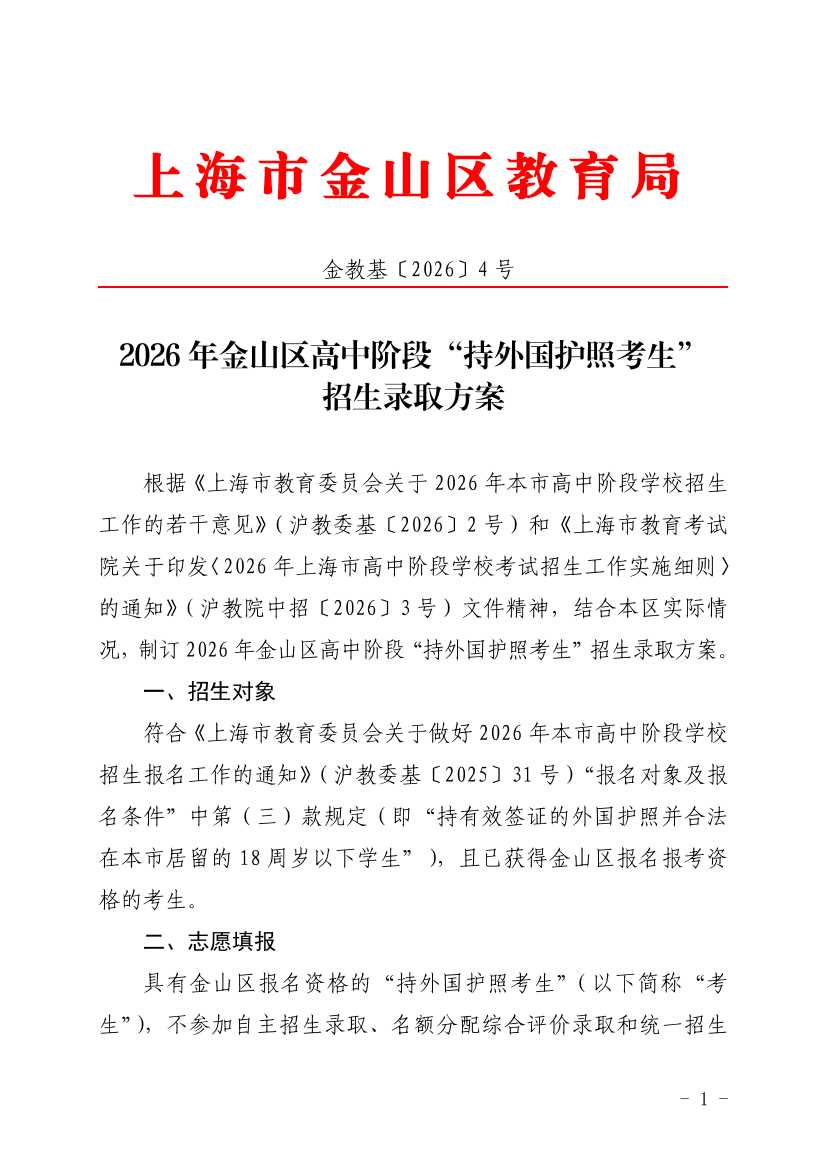 ??根據(jù)《上海市教育委員會(huì)關(guān)于2026年本市高中階段學(xué)校招生工作的若干意見》(滬教委基〔2026〕2號(hào))和《上海市教育考試院關(guān)于印發(fā)〈2026年上海市高中階段學(xué)??荚囌猩ぷ鲗?shí)施細(xì)則〉的通知》(滬教院中招〔2026〕3號(hào))文件精神,結(jié)合本區(qū)實(shí)際情況,制訂2026年金山區(qū)高中階段“持外國護(hù)照考生”招生錄取方案。