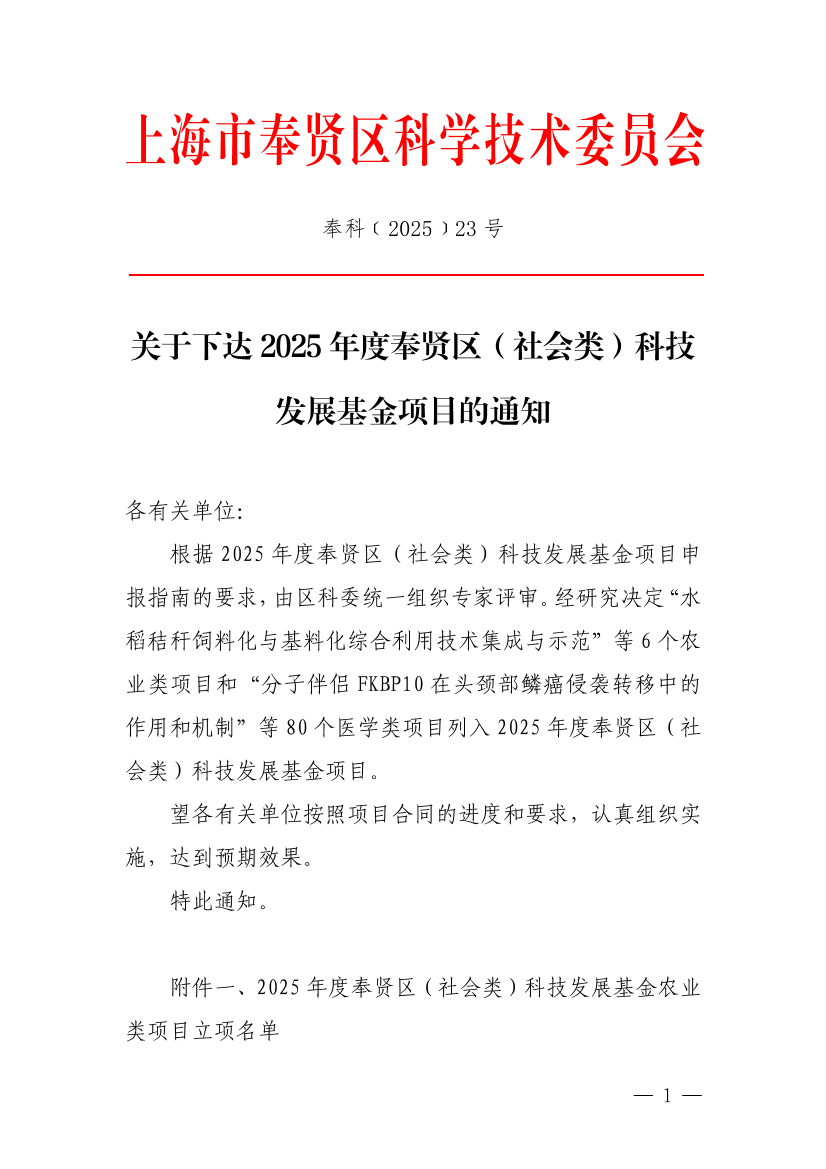 ??根據2025年度奉賢區(qū)(社會類)科技發(fā)展基金項目申報指南的要求,由區(qū)科委統(tǒng)一組織專家評審。經研究決定“水稻秸稈飼料化與基料化綜合利用技術集成與示范”等6個農業(yè)類項目和“分子伴侶FKBP10在頭頸部鱗癌侵襲轉移中的作用和機制”等80個醫(yī)學類項目列入2025年度奉賢區(qū)(社會類)科技發(fā)展基金項目。