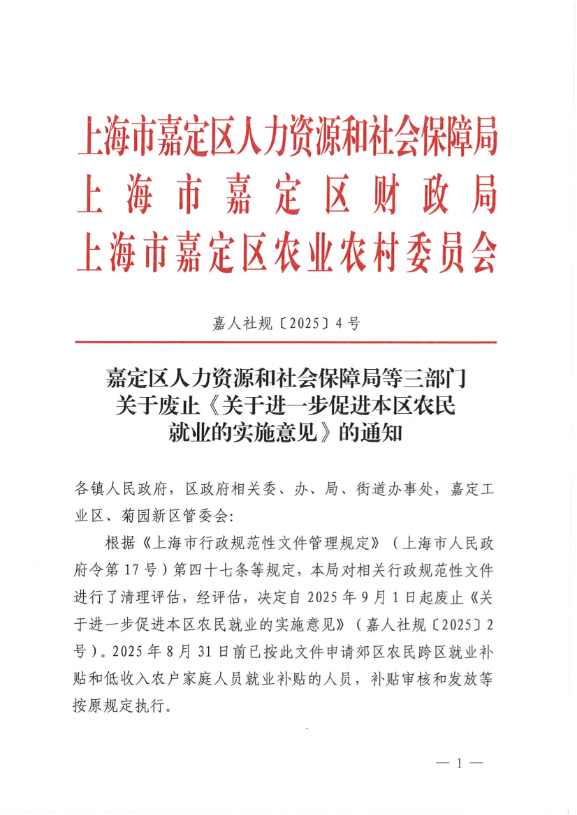 ??根據(jù)《上海市行政規(guī)范性文件管理規(guī)定》(上海市人民政府令第17號)第四十七條等規(guī)定,本局對相關行政規(guī)范性文件進行了清理評估,經(jīng)評估,決定自2025年9月1日起廢止《關于進一步促進本區(qū)農(nóng)民就業(yè)的實施意見》(嘉人社規(guī)〔2025〕2號)。2025年8月31日前已按此文件申請郊區(qū)農(nóng)民跨區(qū)就業(yè)補貼和低收入農(nóng)戶家庭人員就業(yè)補貼的人員,補貼審核和發(fā)放等按原規(guī)定執(zhí)行。
